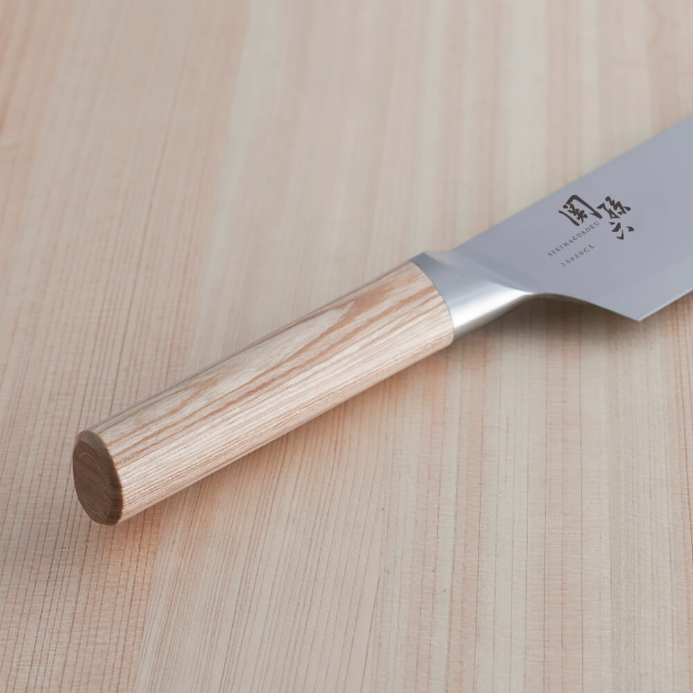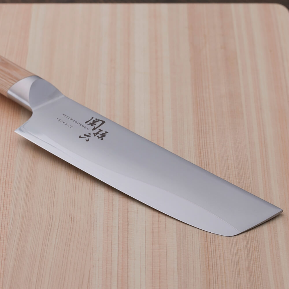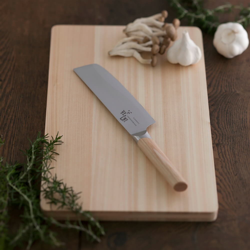特殊精密接合(ろう付け)の技術を利用し、背側と刃側のコントラストで刃の波紋とハンドルは白合板を採用し流麗なデザイン性を表現しました。野菜切りなど、様々な調理で活躍する日本が生んだ万能包丁です。