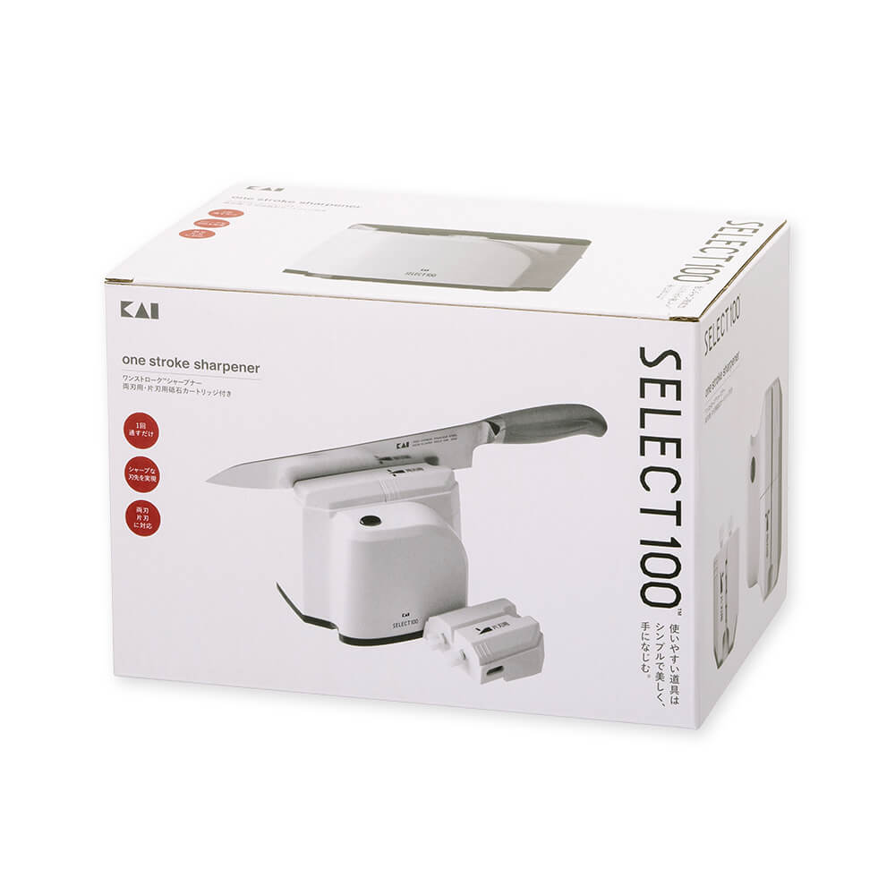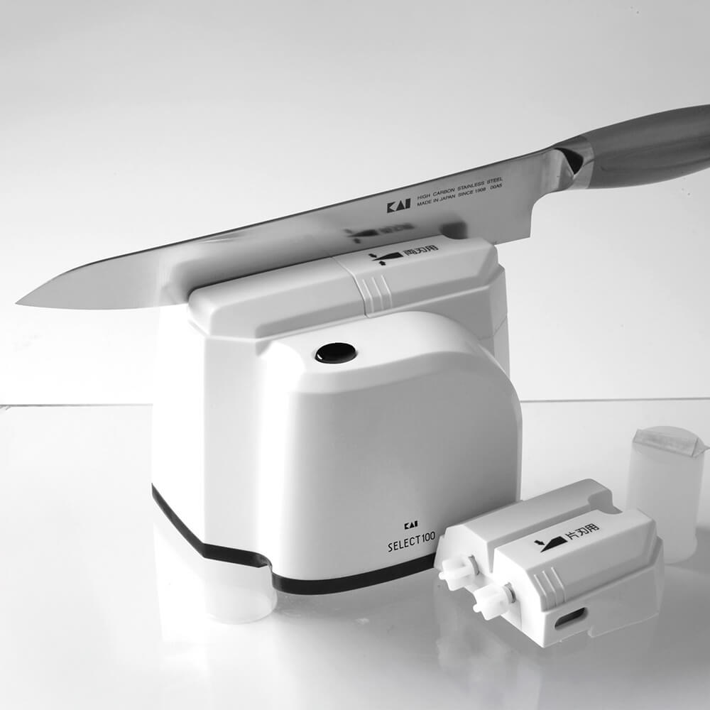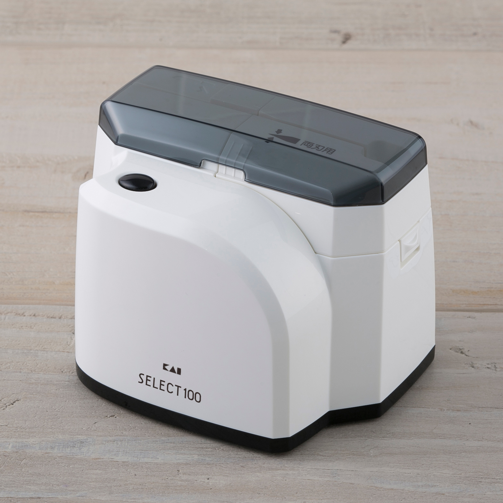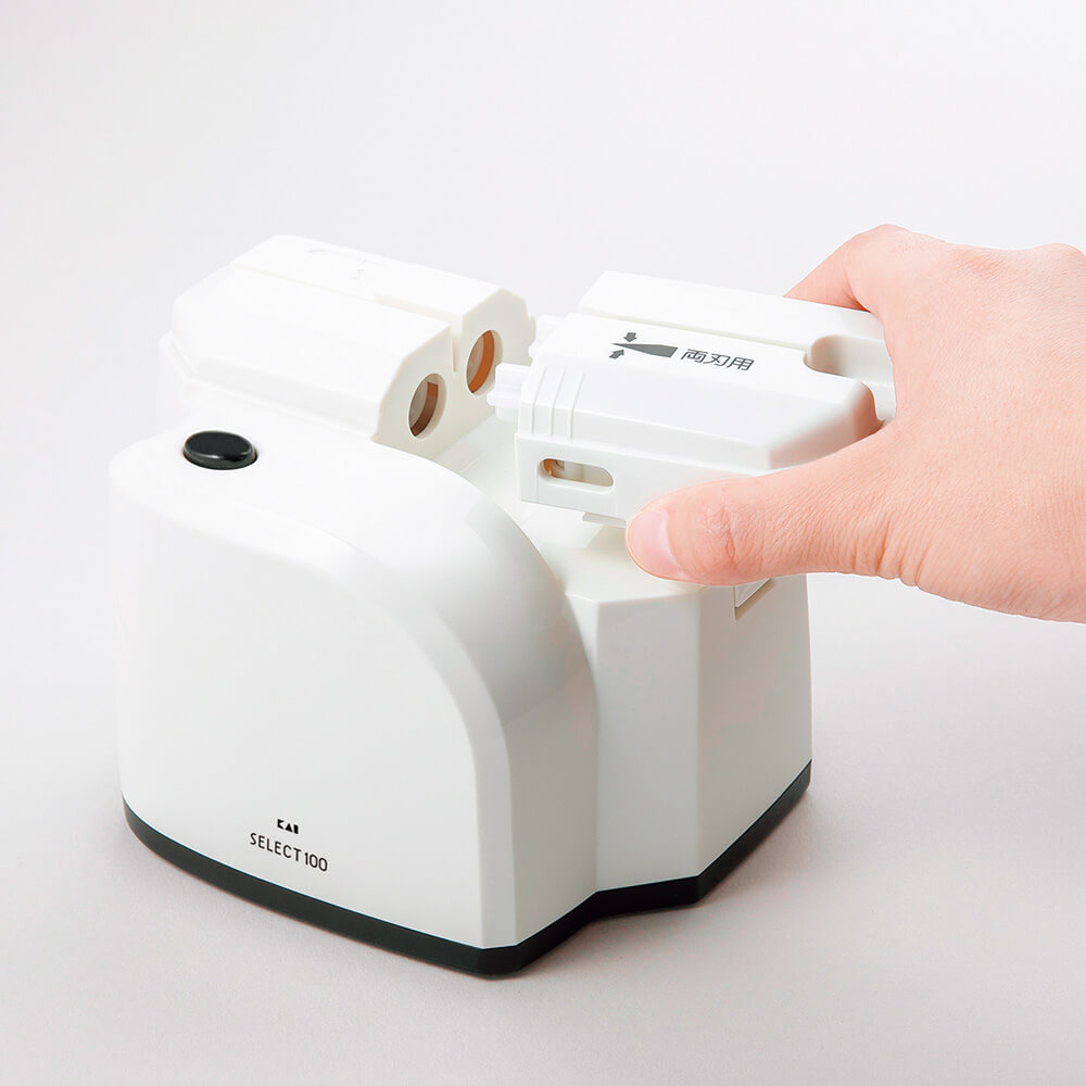 「かえり」(研削残り)が出ない独自の砥石構造で、刃先をシャープに仕上げます。両刃、片刃用の2タイプのカートリッジを交換することで洋包丁だけでなく、刺身・出刃などの和包丁にまで対応。