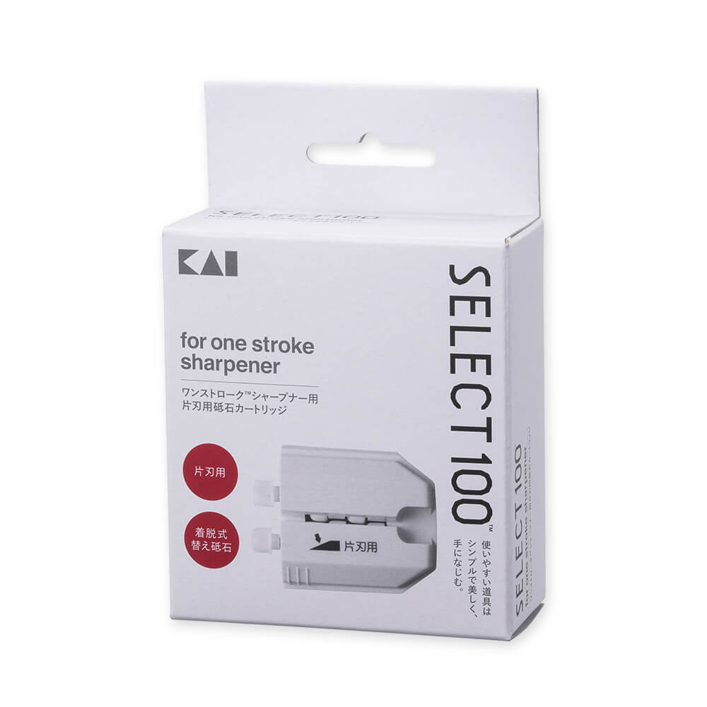 貝印SELECT100ワンストロークシャープナー専用の、片刃用(刺身包丁や出刃包丁など)カートリッジです。カートリッジは単体で水洗い出来ますので、簡単に削りカスを洗浄できます。