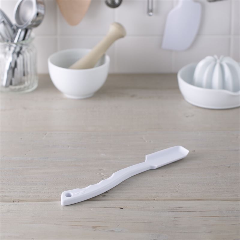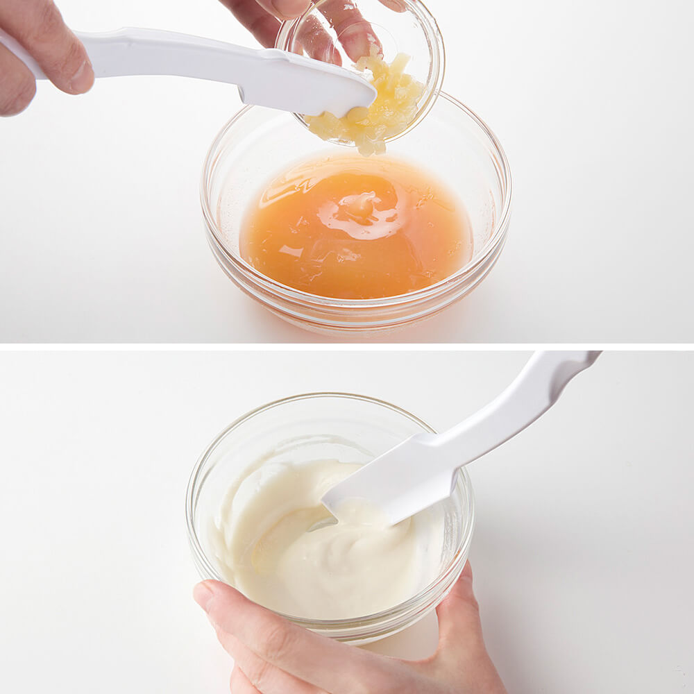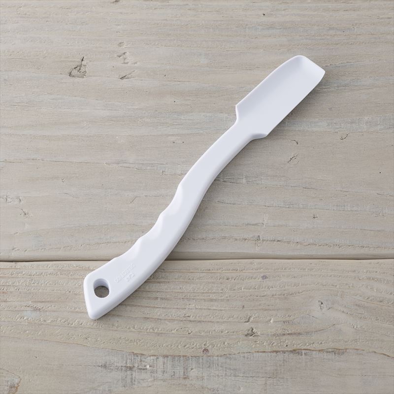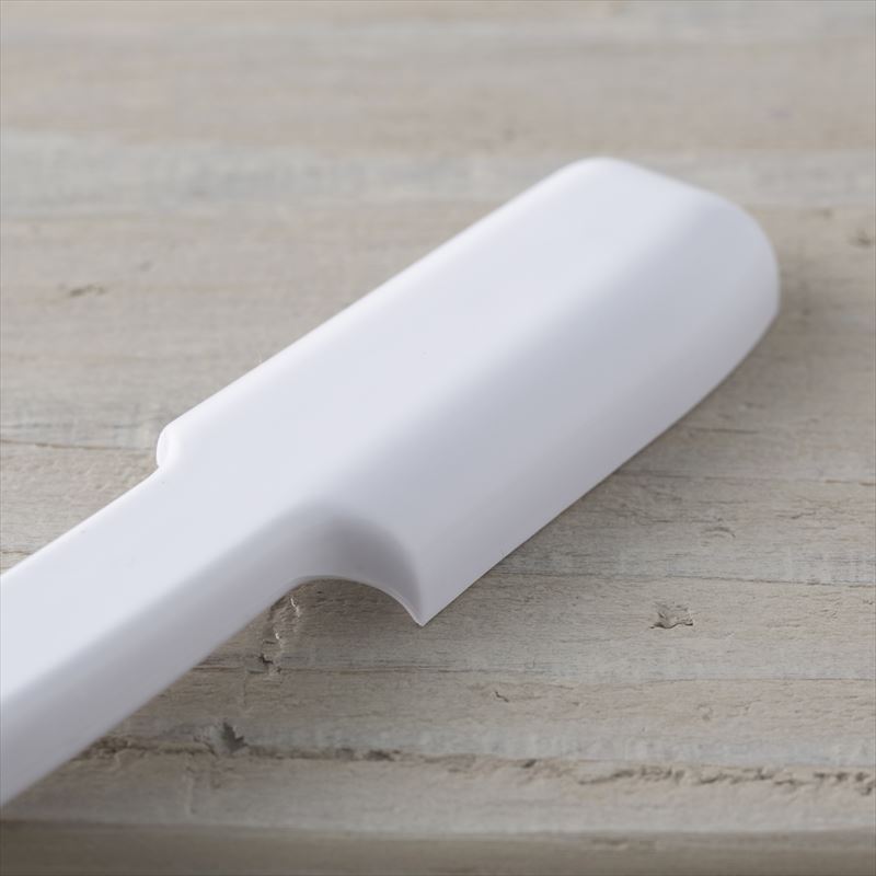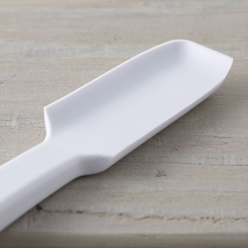 小さいビンからの取り出しや少量の調味料の混ぜ合わせに便利なミニスパチュラ。ハンドルが長いので深い容器でも使いやすい。一体型なので汚れが溜まらずきれいに洗えます。先はすくいやすいようにスコップ形状になっています。