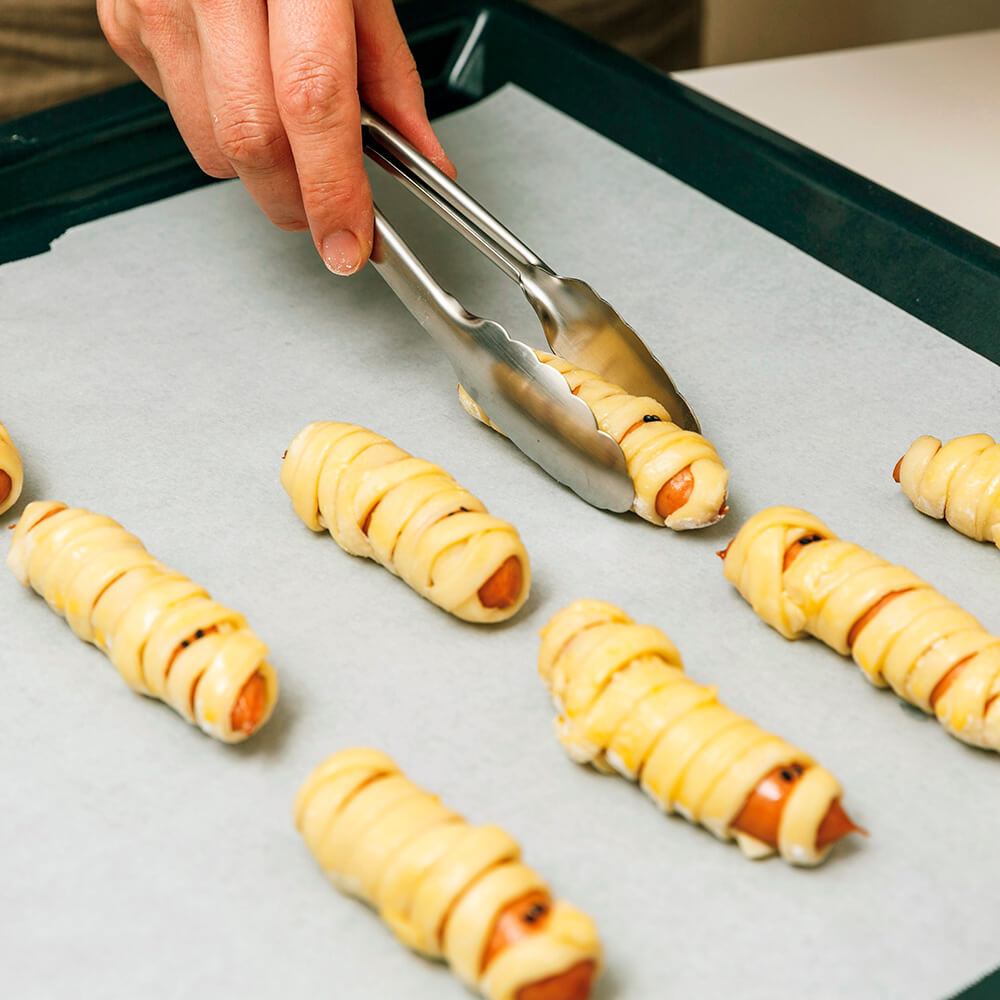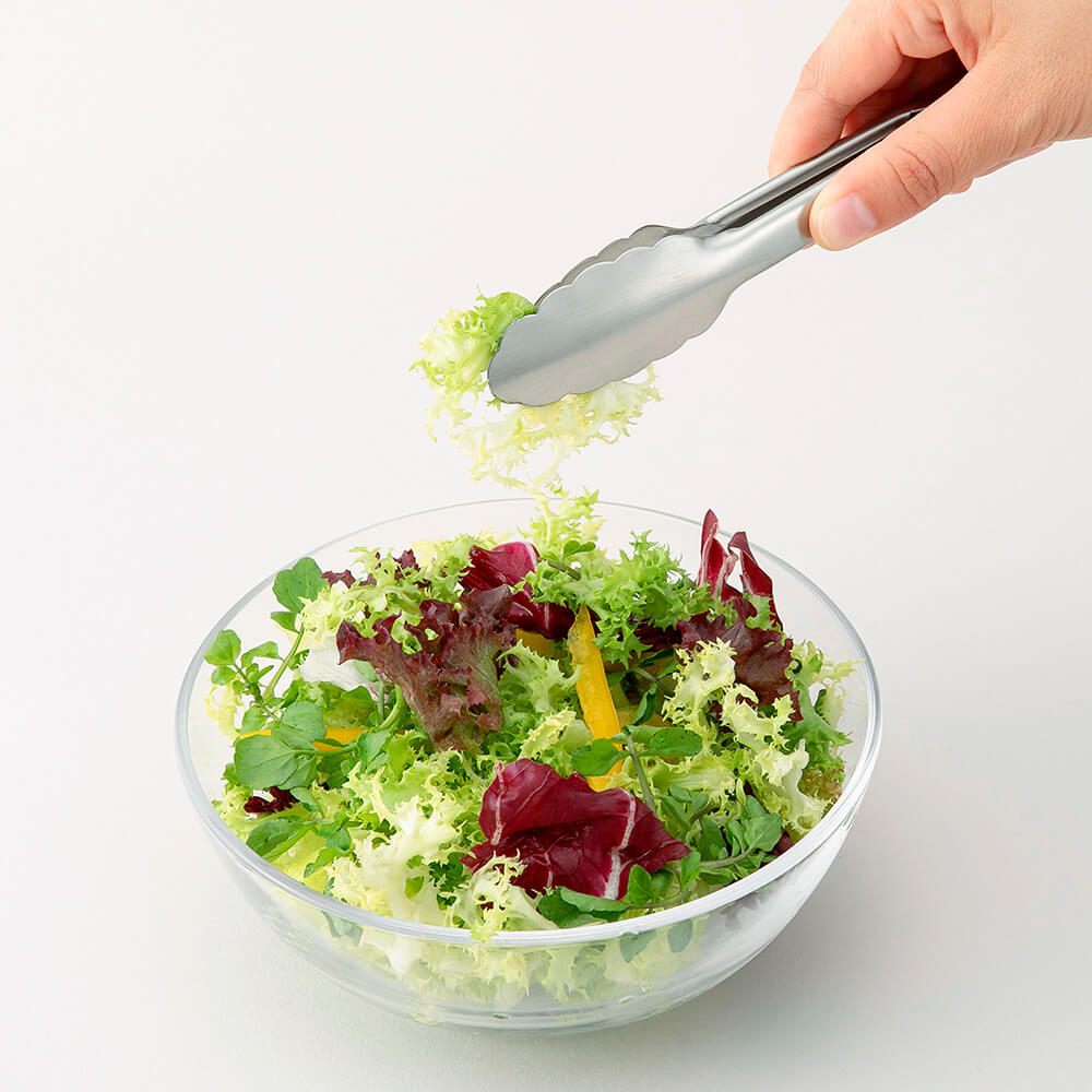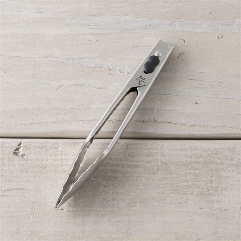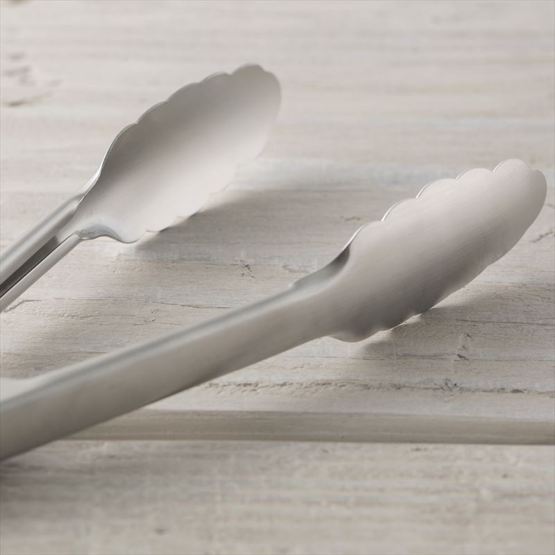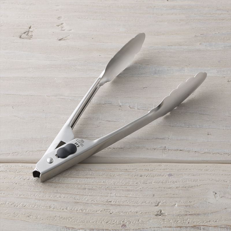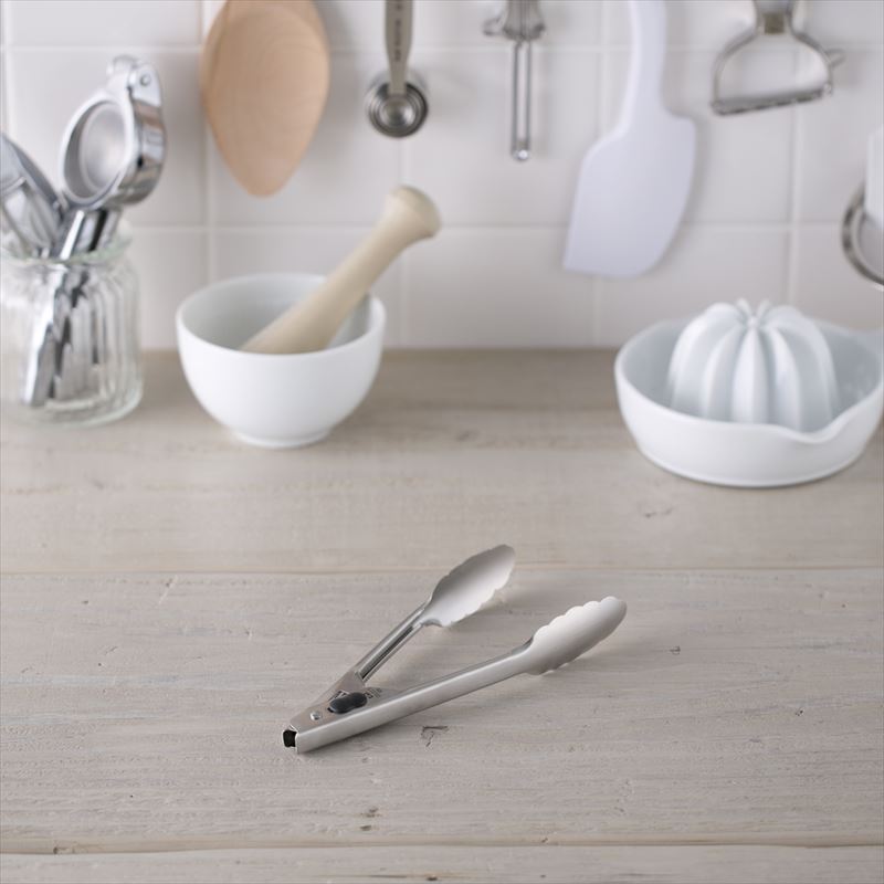 下ごしらえや卓上での取り分けに便利なミニサイズのトングです。収納時にハンドルが閉じるロック機能付。
