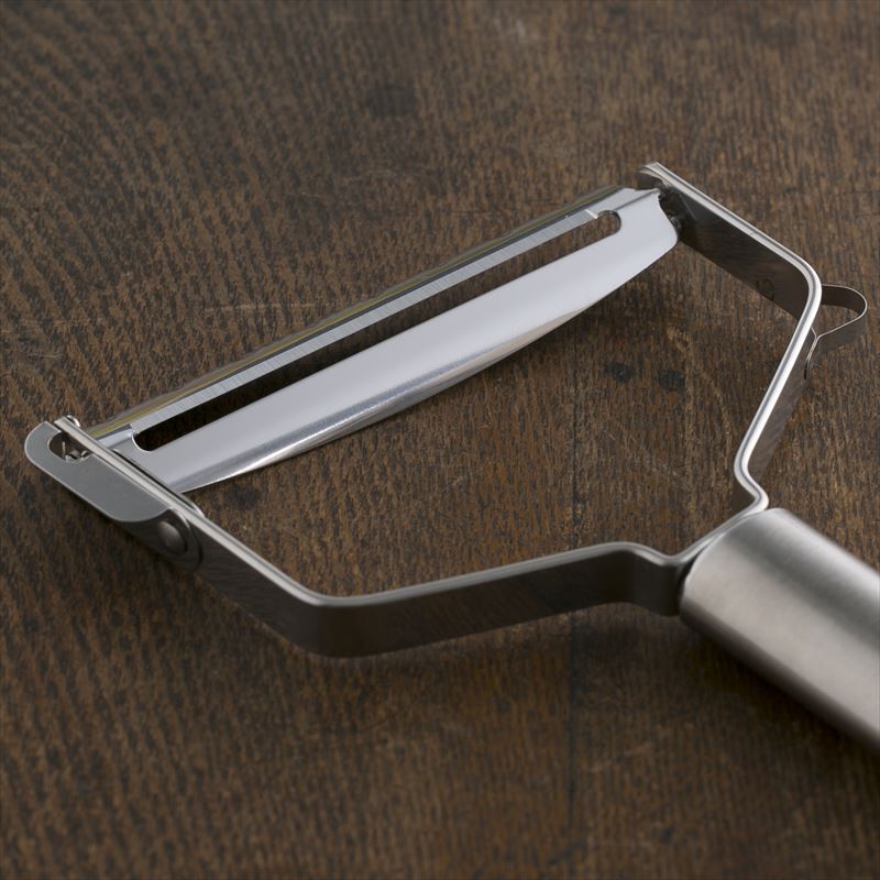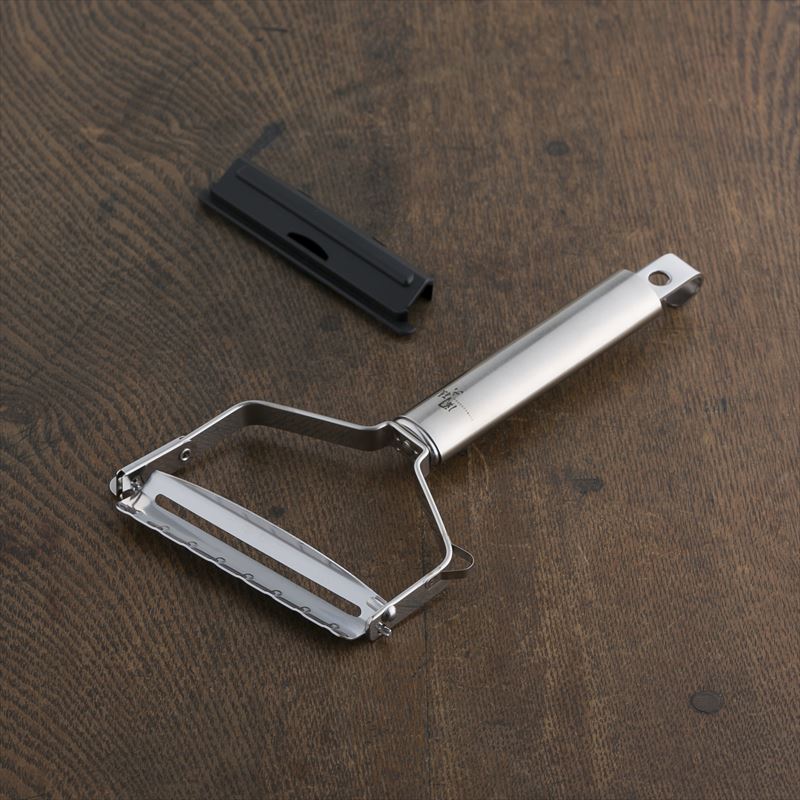 - キャベツの千切りや大根のかつらむきに特に便利なワイドタイプ。切り離れしやすい刃部形状と芽が取り易いU字タイプの芽取りも特徴。刃の材質にはハイカーボン材を採用しているので切れ味の持続性が向上しています。収納時に安全な刃カバー付。