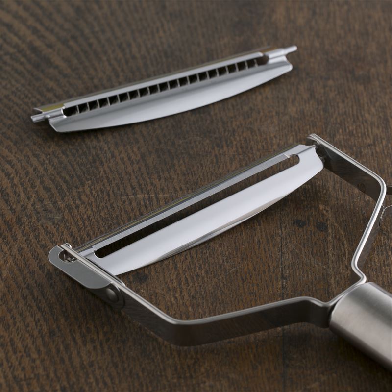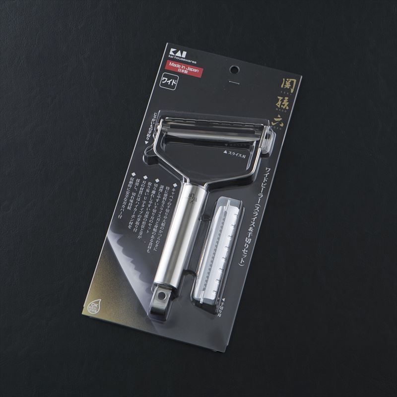 キャベツの千切りや大根のかつらむきに特に便利なワイドタイプ。切り離れしやすい刃の形状と芽が取り易いU字タイプの芽取りも特徴。刃の材質にはハイカーボン材を採用しているので切れ味の持続性が向上しています。千切り刃とのセットタイプ。収納時に安全な刃カバー付。