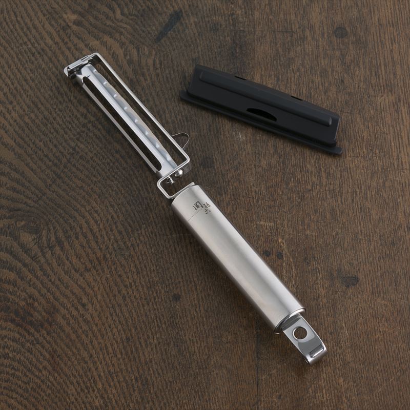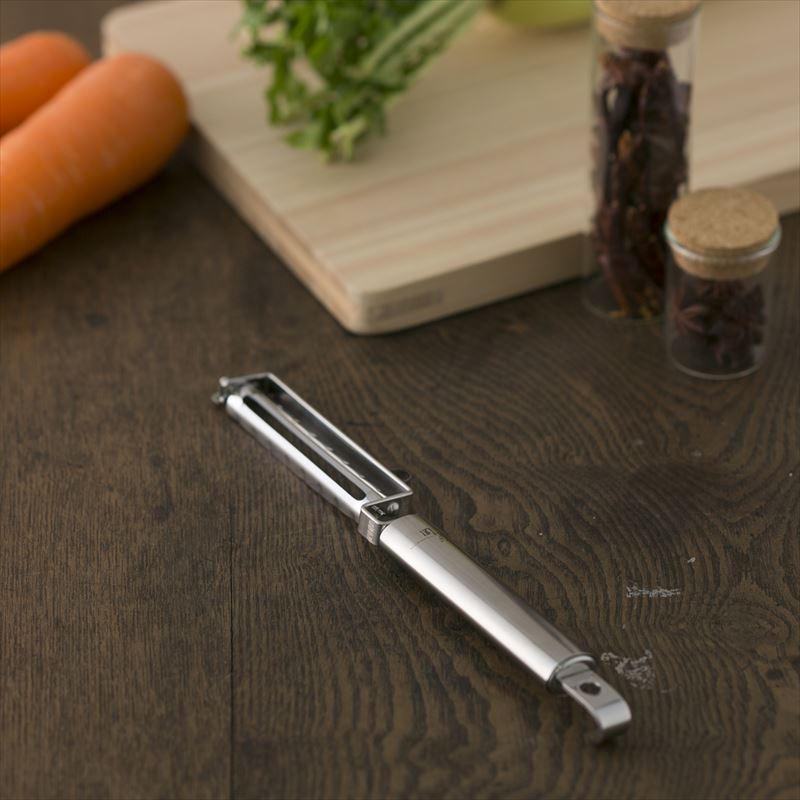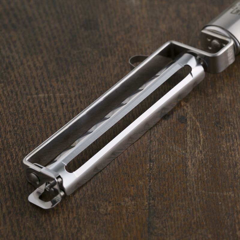 - 最近日本でも認知されてきたフルーツナイフのように使用できる縦型タイプ。キャベツの千切りや大根のかつらむきにも便利なロングタイプ。切り離れしやすい刃の形状と芽が取り易いU字タイプの芽取りも特徴。刃の材質には、ハイカーボン材を採用しているので切れ味の持続性が向上しています収納時に安全な刃カバー付。
