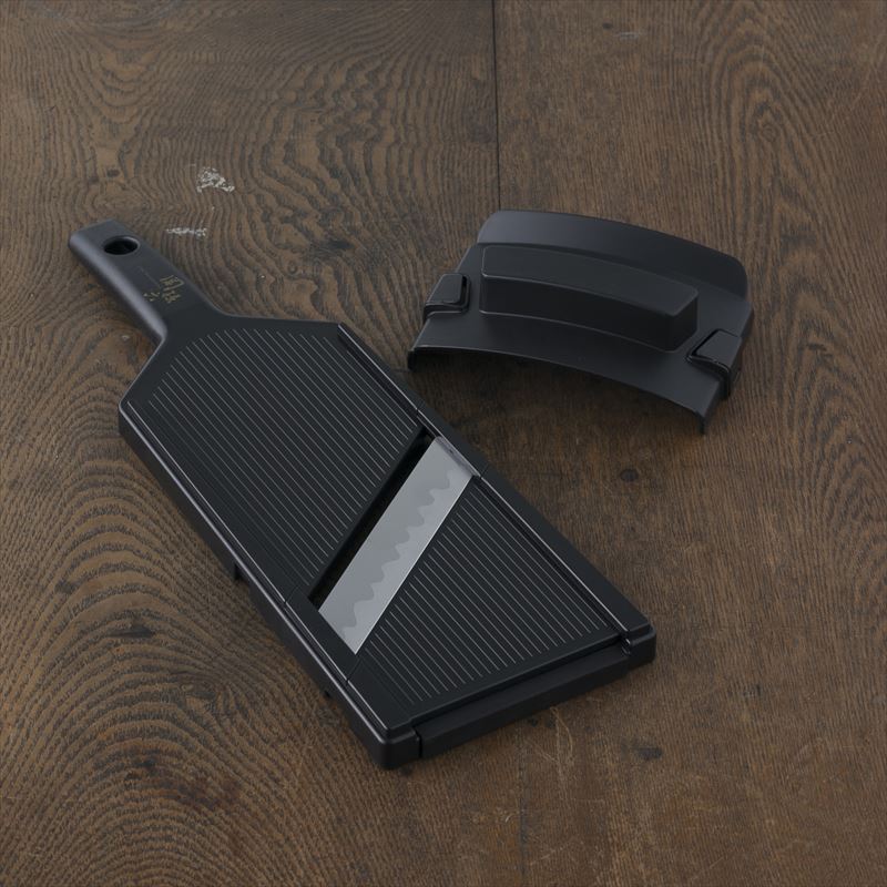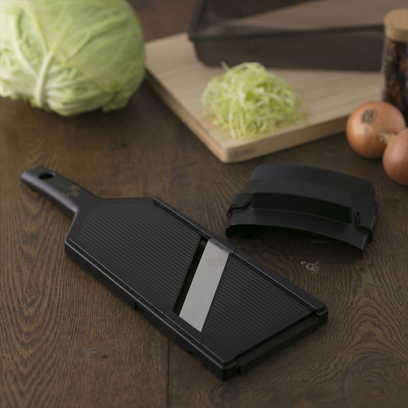 身幅のあるキャベツの千切りに最適なワイドタイプのスライサーでとんかつ屋さんのようなふんわりキャベツの千切りが出来ます。刃の材質には、ハイカーボン材を採用、刃付けも2段刃付けしているので切れ味の持続性が向上しています。先を直置きして調理する時に滑りにくいように滑り止め付。ボールに上で調理する時に安定する切り欠き付。調理時と収納時に安全なガード付。