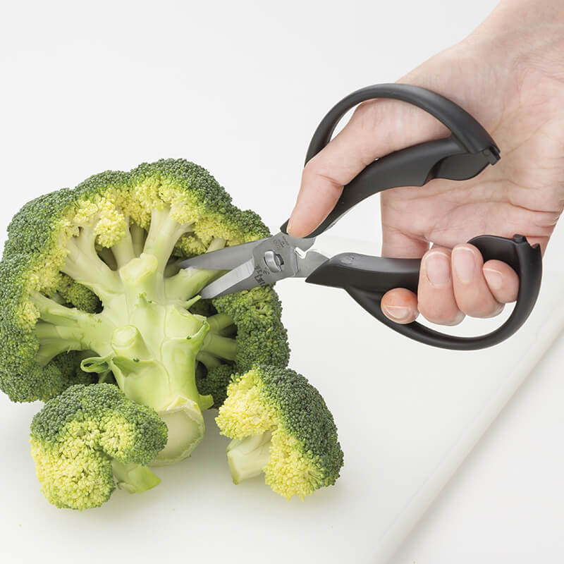刃先が短く細かい作業がしやすいキッチン鋏。きのこの軸、ブロッコリの小房、肉の筋や脂肪、赤とうがらしなどに便利。ハーブの茎と葉を切り分けるハーブストリッパー機能付。刃がはずせるので、きれいに洗えます。