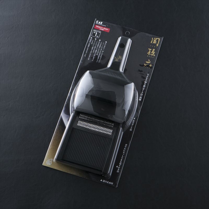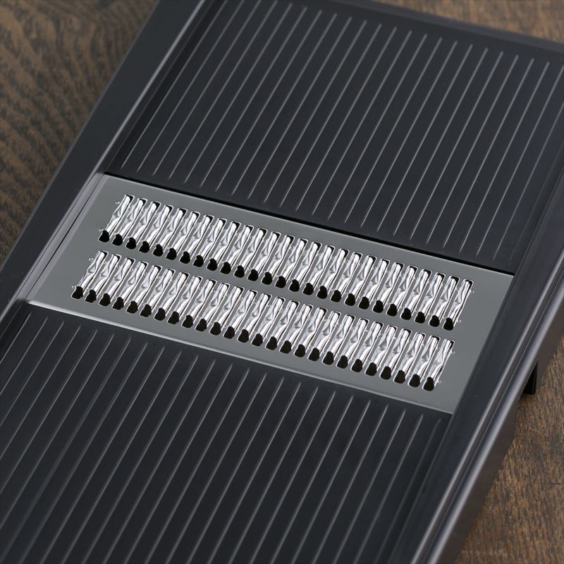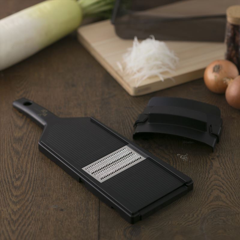 - 切れ味良く、押し引き両方スピーディーに千切りが出来る特殊クランク刃を採用した千切り器。先を直置きして調理する時に滑りにくいように滑り止め付。ボールに上で調理する時に安定する切り欠き付。調理時と収納時に安全なガード付。千切り幅:約1mm幅