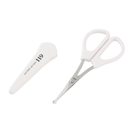 日々のお手入れをはじめ、身だしなみを整える貝印の衛生用品「119」シリーズ。刃先が丸い設計なので、鼻のお手入れなどに最適なセーフティハサミ。収納に便利なキャップ付です。