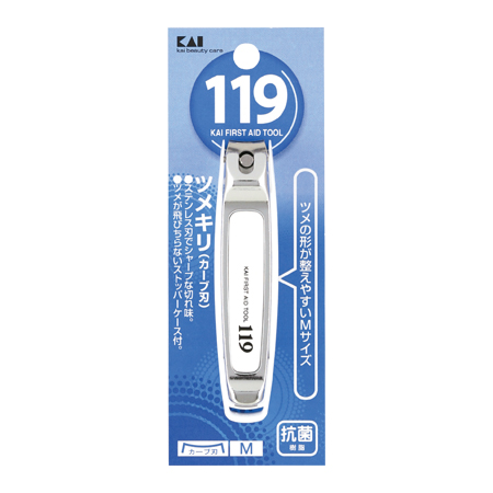 日々のお手入れをはじめ、身だしなみを整える貝印の衛生用品「119」シリーズ。ステンレス刃でシャープな切れ味のツメキリ。爪が飛び散らないストッパー付。形が整えやすいMサイズ。