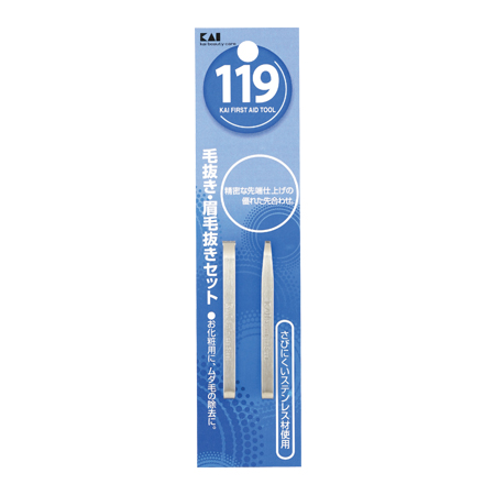 日々のお手入れをはじめ、身だしなみを整える貝印の衛生用品「119」シリーズ。お化粧用に、ムダ毛の除去に最適な毛抜きセット。繊細な先端仕上げと優れた先合わせに加え、さびにくいステンレス材を使用。