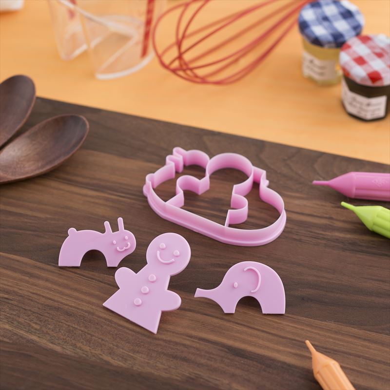 クックパッドのユーザーの声を集めて、楽しく使える製菓用品を貝印・クックパッドでコラボ開発いたしました。一度にひと、ゾウ、ウサギが抜けるクッキー型です。付属のパーツを型に合わせて押すと、表情がついてかわいく仕上がります。