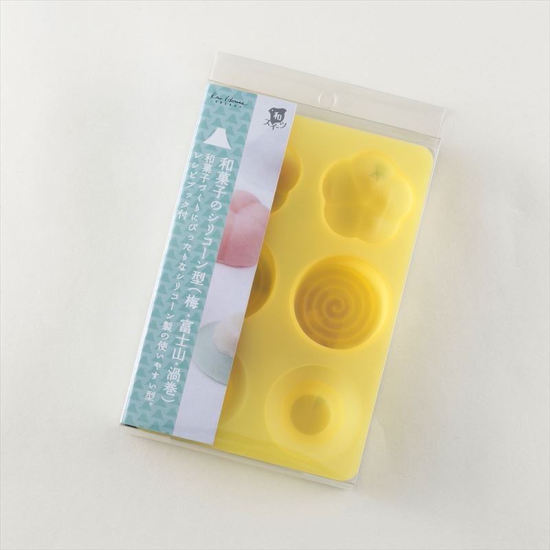 梅・富士山・渦巻きをモチーフにした和菓子がつくれます。扱いやすいシリコーン製でお手入れも楽ちん。レシピブック付き。