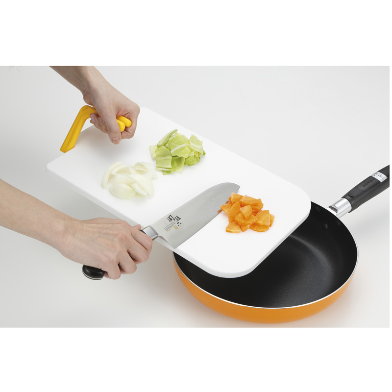 ハンドルが付いた、ちょっとかわいいまな板です。切った食材をそのままお鍋に運ぶのもラクラク。