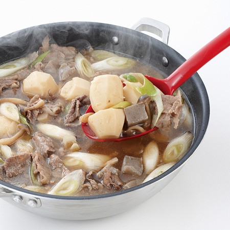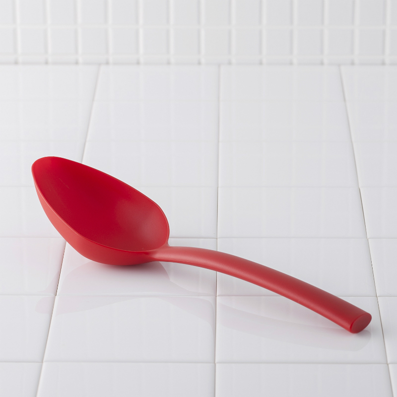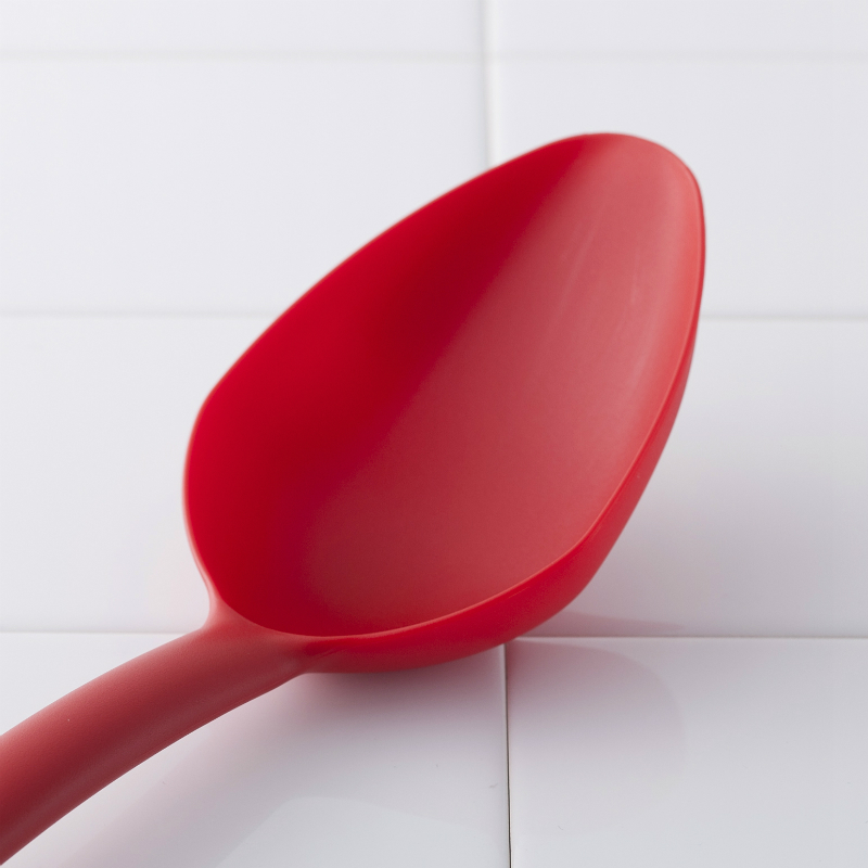 レードルと盛り付けスプーンの機能を合わせたニューツールが登場です。耐熱素材を使用しているので、加熱中のお鍋やフライパンでの使用が可能。十分な深さがあるので、スープなども盛り付けることができます。お玉の先端部分で細かい作業ができ、上手に盛り付けることができます