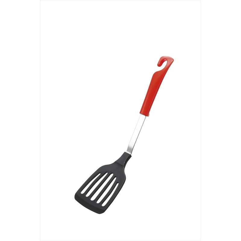 耐熱温度が高く、フッ素加工のフライパンを傷つけずに使えるナイロン製ターナーです。ちょい掛けができる、フック形状のハンドルです。