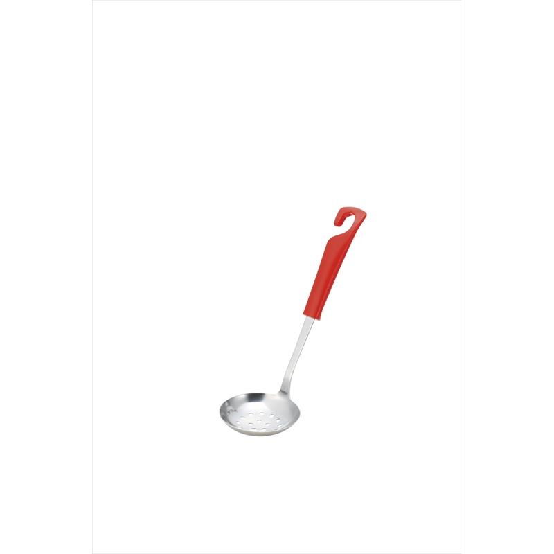 卓上のお鍋の取り分けにも便利な小さめサイズのお玉です。具だけすくえる穴あきタイプです。ちょい掛けができる、フック形状のハンドルです。