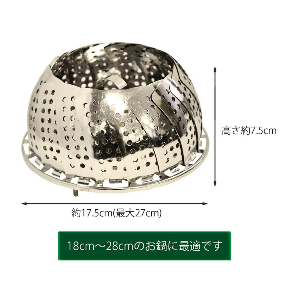 18?28cmの鍋に対応可能な蒸し器です。真ん中の持ち手は不要な時取り外して使えます。