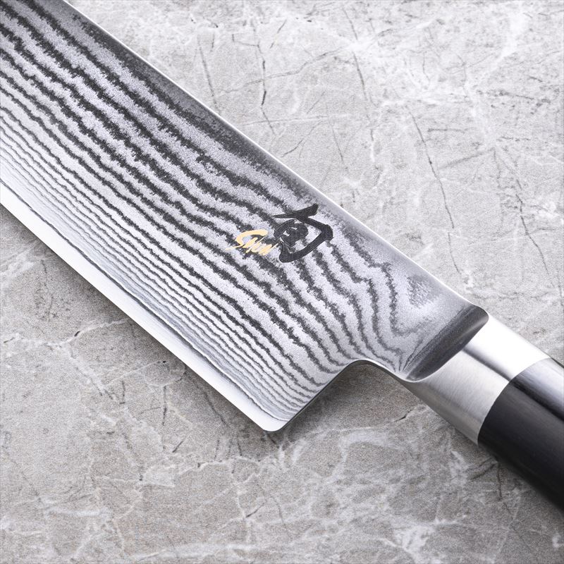 季節の移ろいをあじわい、より多彩に楽しむための包丁ブランド、「旬」。硬さの異なるステンレスを重ね合わせた33層構造により、刃体の表面に木目のように美しいダマスカス模様が広がります。貝印が長年の刃物作りで培ってきた刃付けの技術と、高硬度・高炭素のVG-MAX材を芯材に採用することで、鋭い切れ味が永く続きます。鋲を使わず美しく仕上げた積層強化木のD型ハンドルは手に程よくフィットします。 機能美を追求した道具「旬」は、台所のみならず卓上で、魅せる道具として、新しい生活に彩りを加えます