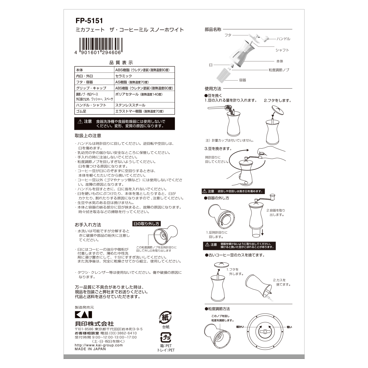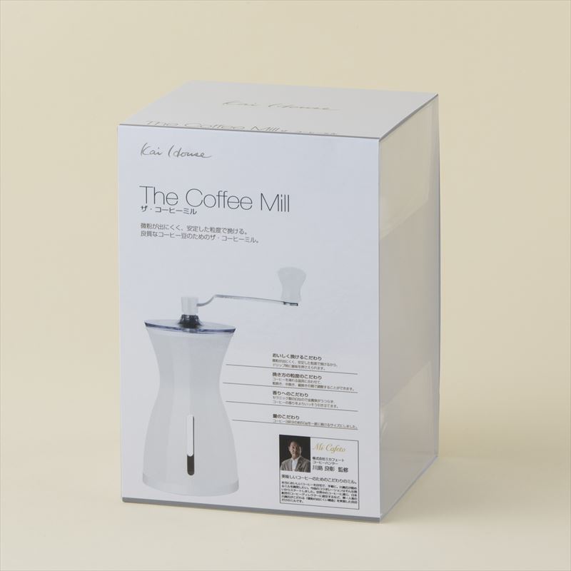 本当においしいコーヒーを自宅で、手軽に。今回のコラボレーションはそんな想いからスタートしました。世界中のコーヒーに通じ、日本航空のコーヒーディレクターに就任するなど、第一人者の川島氏がこだわる「微粉の出にくい構造」を実現した貝印だけのコーヒーミルです。光沢のある質感、すっきりとした清潔感が魅力の新色スノーホワイトが仲間入りしました。