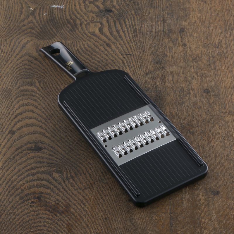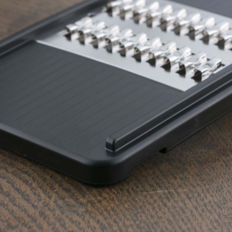 切れ味良く、押し引き両方スピーディーに千切りが出来る特殊クランク刃を採用した千切り器。先を直置きして調理する時に滑りにくいように滑り止めと、ボールに載せて調理する時に安定する切り欠き付。食材が目詰まりしにくい快適仕様です。