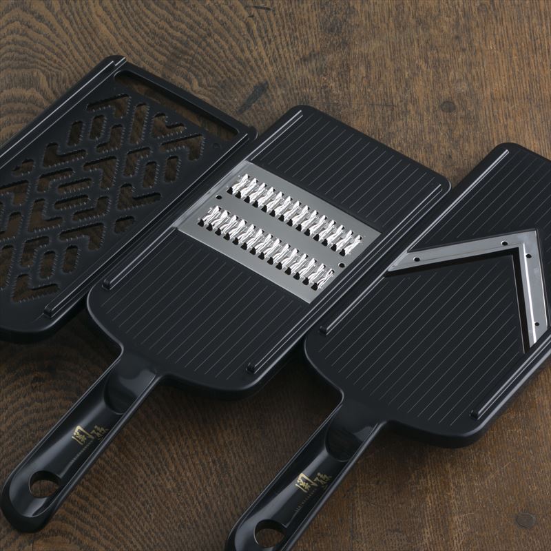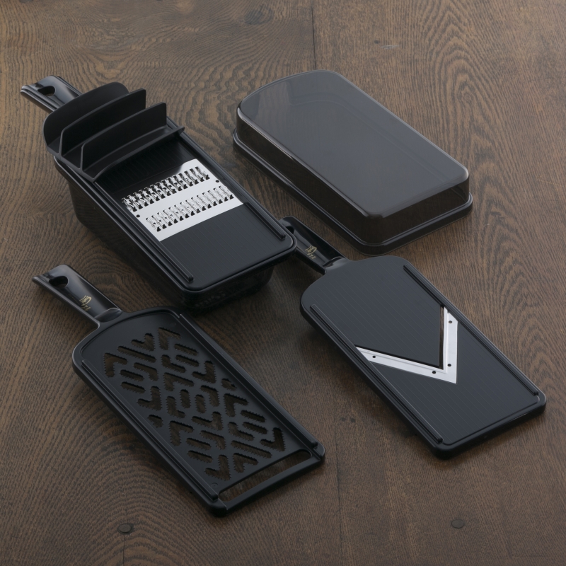 1台で「おろし・スライス・2mmの千切り」ができる調理器セットです。指ガード付なので、無駄なく調理ができます。蓋がそのまま受け皿となり、すべてがコンパクトに収納できます。