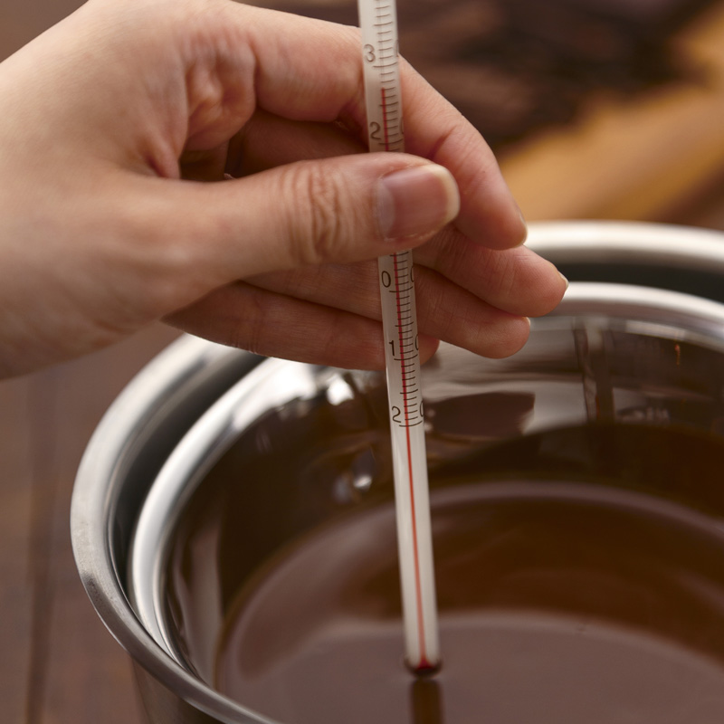 手間のかかるテンパリング作業をスムーズに。10℃単位の目盛りで100℃まで計れます。