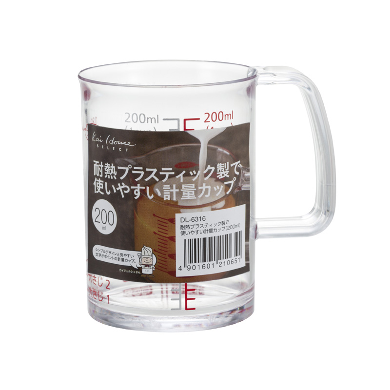 シンプルデザインと見やすい文字がポイントの、200mlまで計量できる計量カップです。