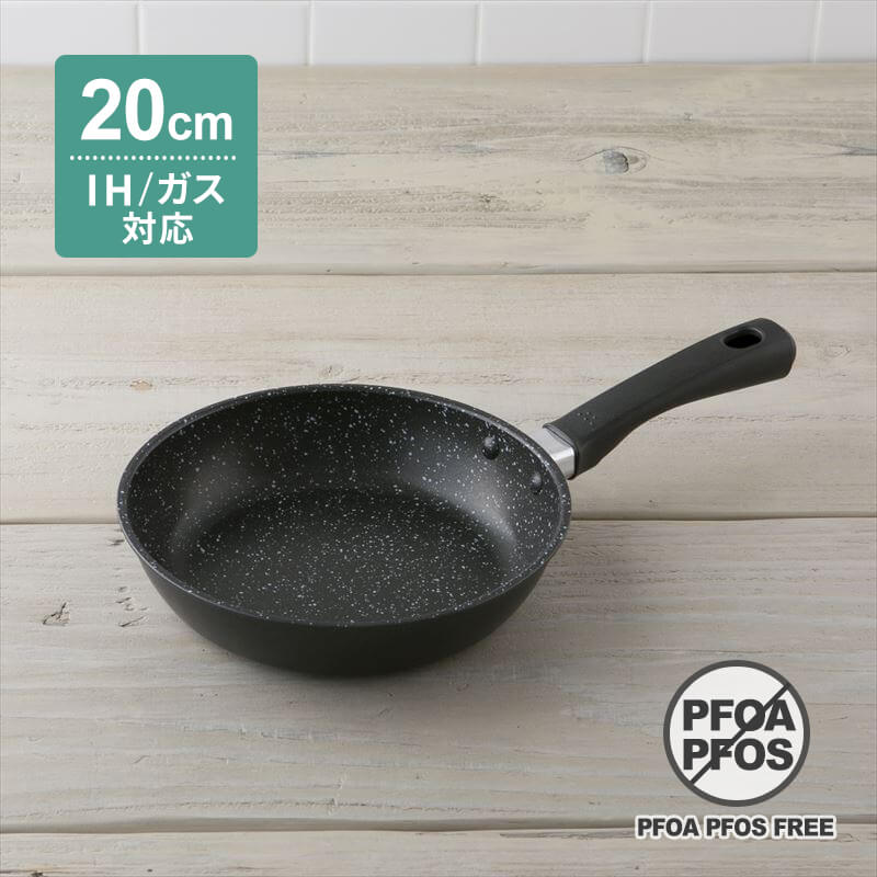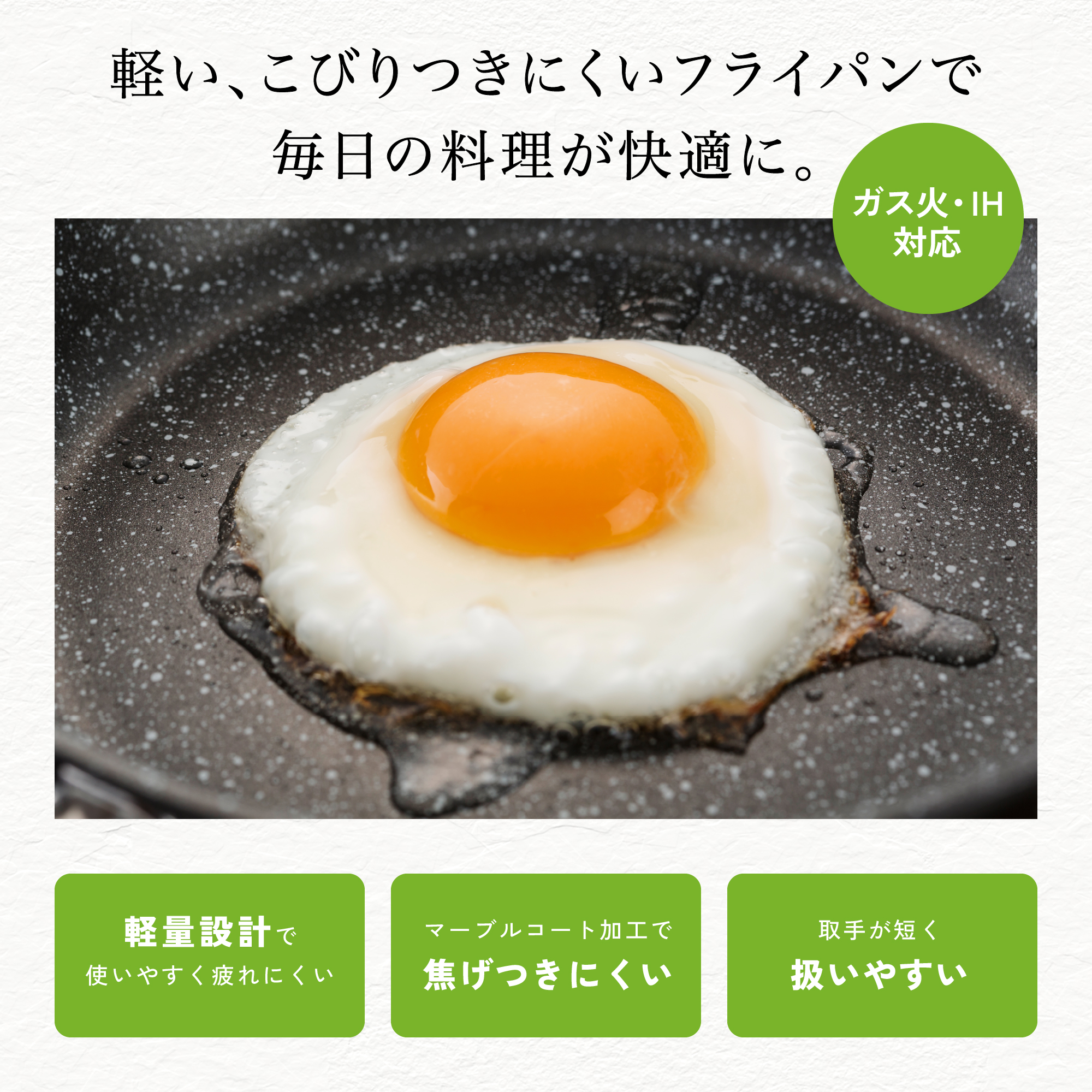 - 〈PFOA/PFOSフリー〉当社比約20%の軽量化を実現。軽くてラクラク、しかも本格派!使いやすさにトコトンこだわったシリーズです。特長アルミ鋼材の底面を厚く、サイド面を薄く加工するスピン製法を採用することで、熱効率を高めています。特長ハンドルの長さを短くし、重量バランスを工夫することで『重さを感じにくい』構造に設計しています。薄い側面はフライパン全体に素早く熱が回り、厚い底面が保温性を高めるので「時短」調理にも一役買う機能性フライパンです。こちらのフライパン・鍋はPFOA、およびPFOSを使用しておりません。
