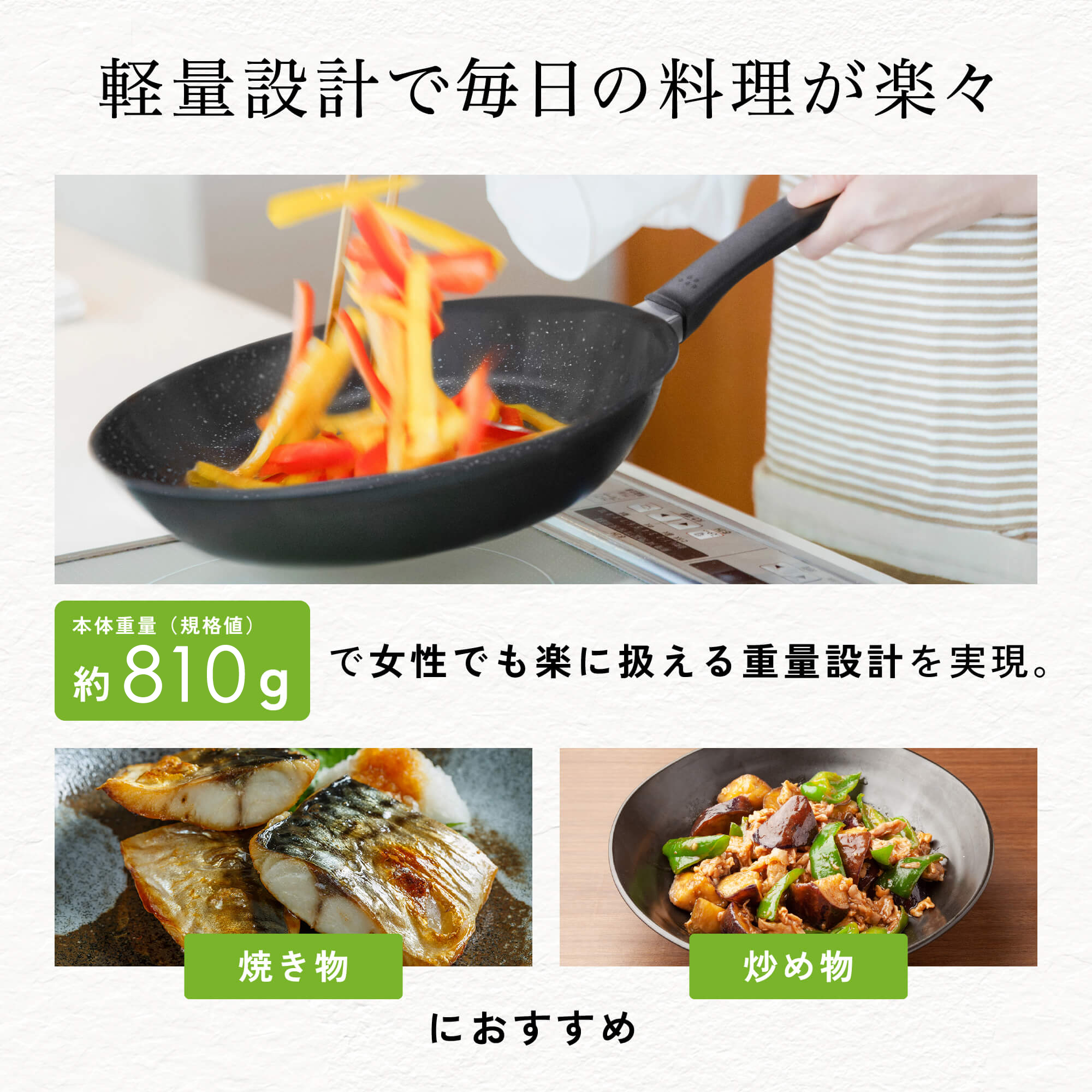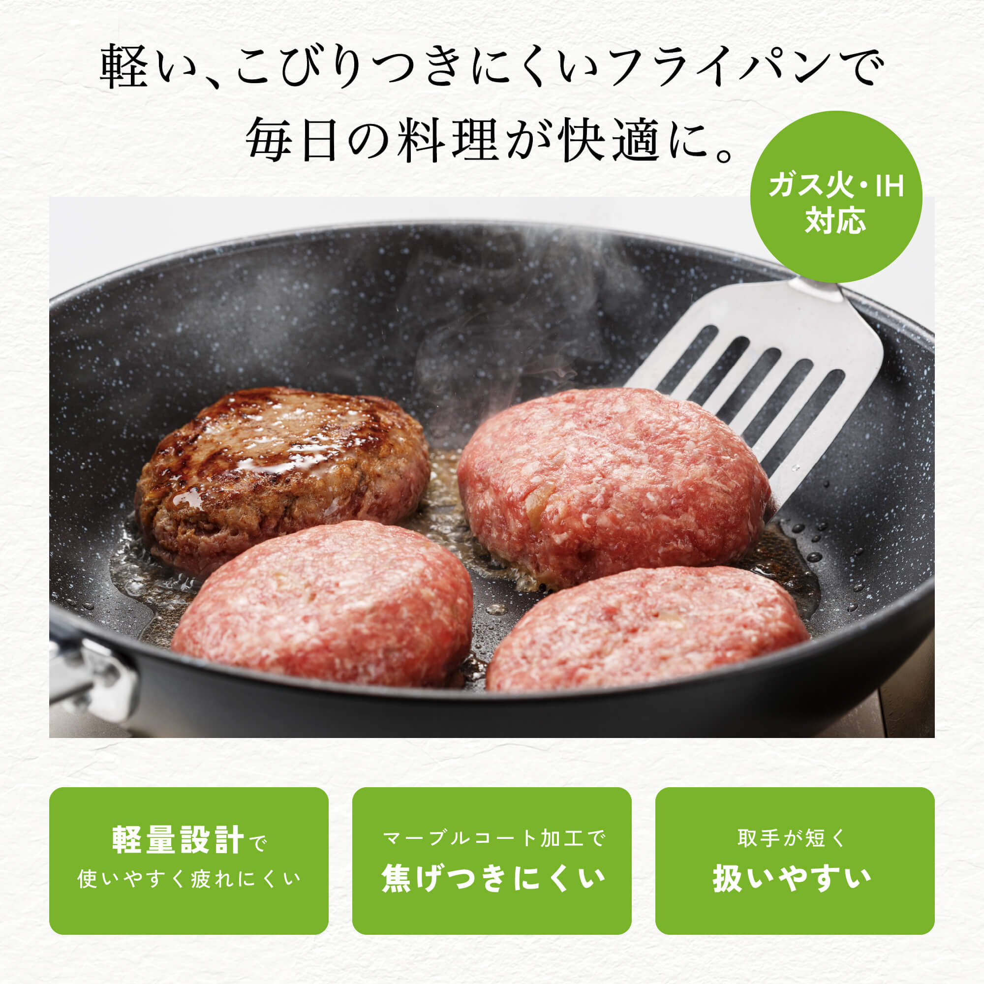 - 〈PFOA/PFOSフリー〉当社比約20%の軽量化を実現。軽くてラクラク、しかも本格派!使いやすさにトコトンこだわったシリーズです。特長アルミ鋼材の底面を厚く、サイド面を薄く加工するスピン製法を採用することで、熱効率を高めています。特長ハンドルの長さを短くし、重量バランスを工夫することで『重さを感じにくい』構造に設計しています。薄い側面はフライパン全体に素早く熱が回り、厚い底面が保温性を高めるので「時短」調理にも一役買う機能性フライパンです。こちらのフライパン・鍋はPFOA、およびPFOSを使用しておりません。
