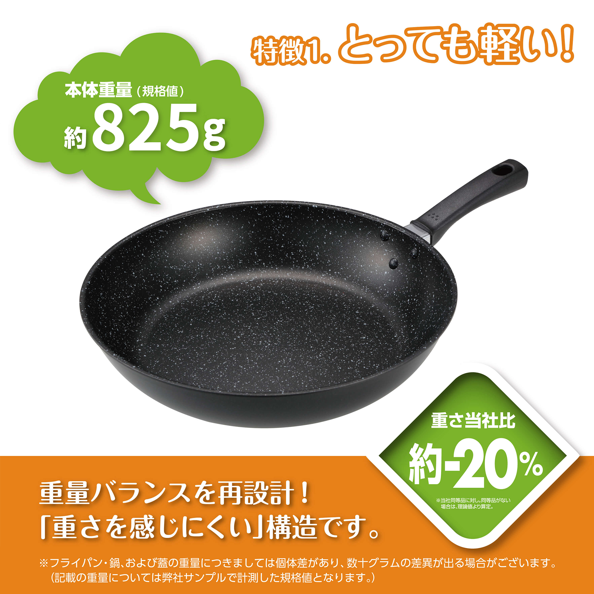 - 〈PFOA/PFOSフリー〉当社比約20%の軽量化を実現。軽くてラクラク、しかも本格派!使いやすさにトコトンこだわったシリーズです。特長アルミ鋼材の底面を厚く、サイド面を薄く加工するスピン製法を採用することで、熱効率を高めています。特長ハンドルの長さを短くし、重量バランスを工夫することで『重さを感じにくい』構造に設計しています。薄い側面はフライパン全体に素早く熱が回り、厚い底面が保温性を高めるので「時短」調理にも一役買う機能性フライパンです。こちらのフライパン・鍋はPFOA、およびPFOSを使用しておりません。