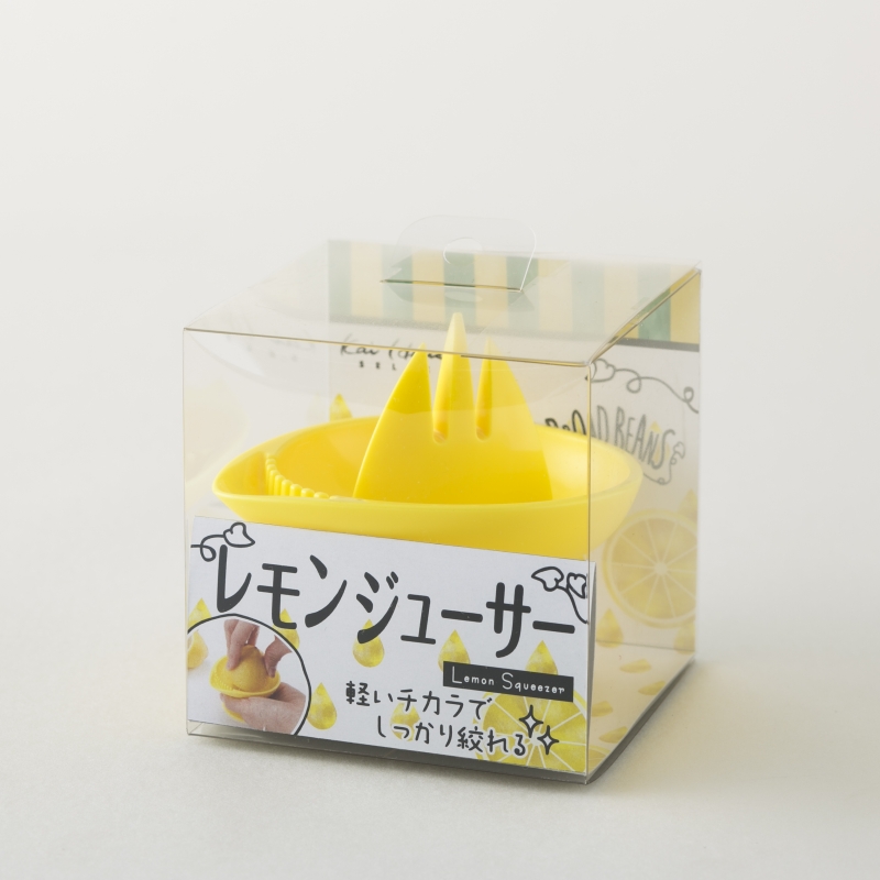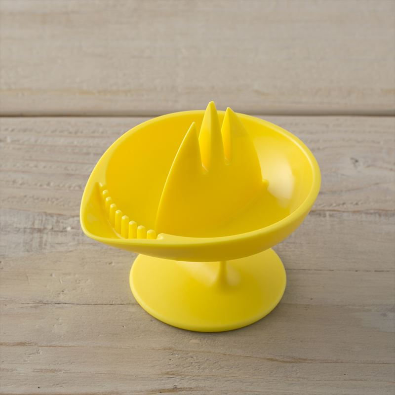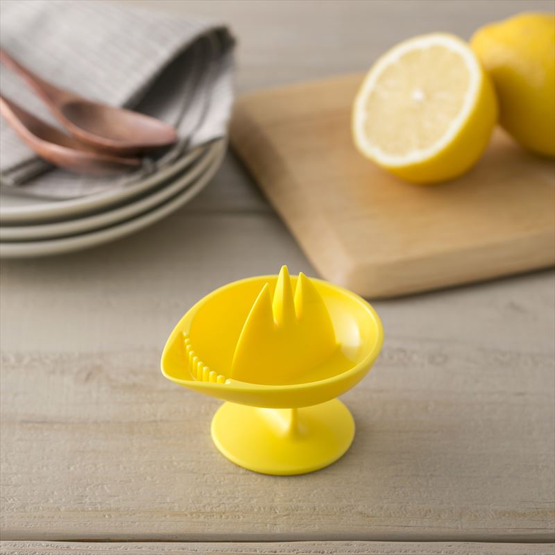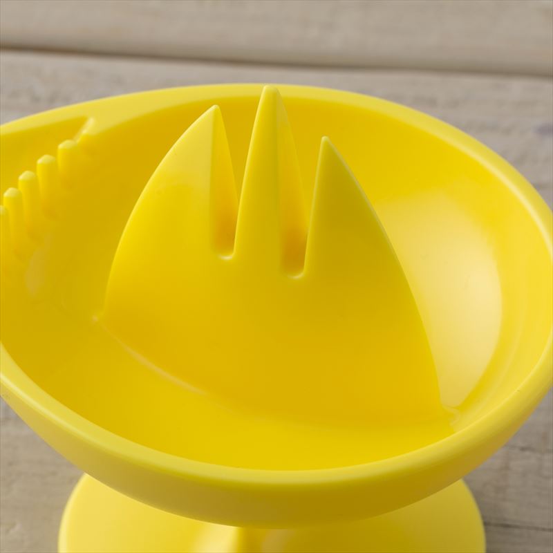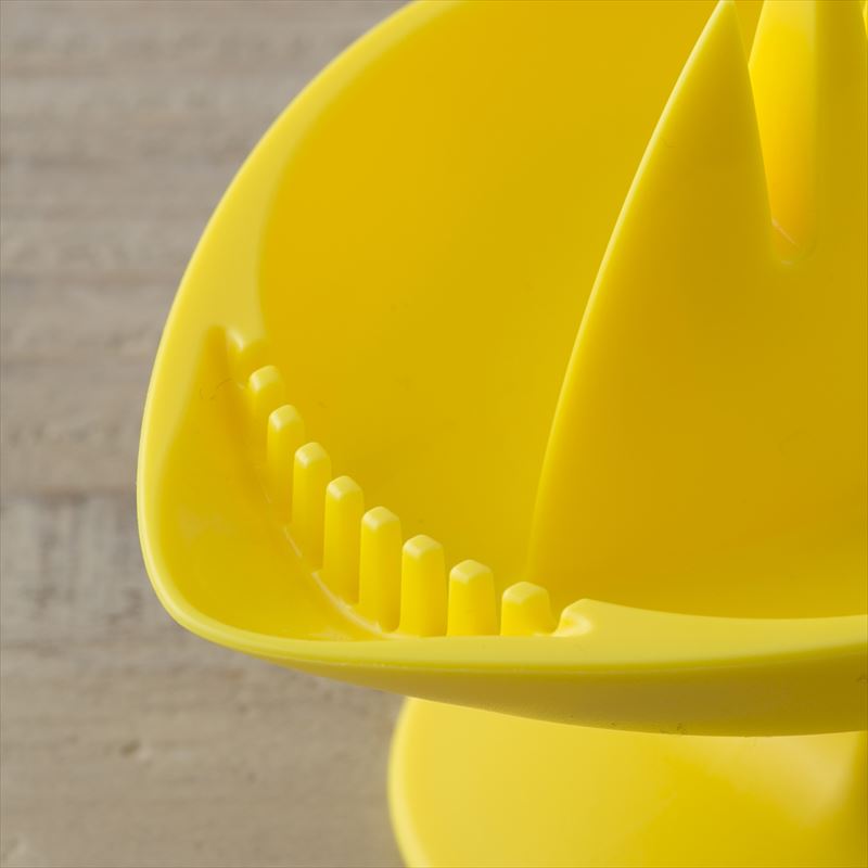 山型の切り込みにカットしたレモンを差し込んで使うレモンジューサーです。果肉をしっかりとらえ、軽い力でひねるだけでレモンが絞れます。注ぎ口には種取りが付いており、テーブルなどの平面上で自立する設計です。