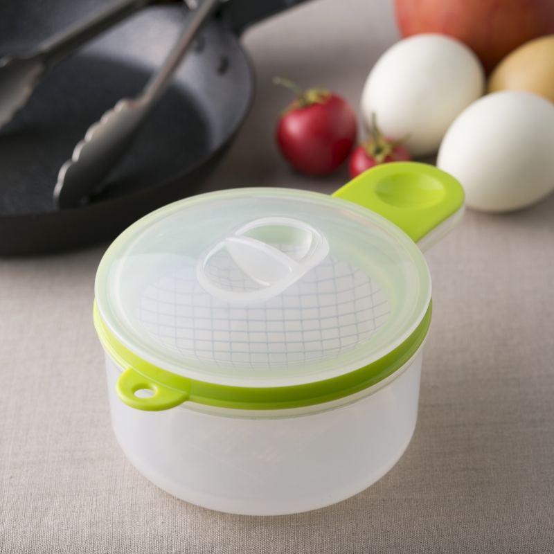 たまごサンドを作るときに便利な、ゆでたまごのみじん切り器です。ゆで卵をつぶす→マヨネーズなどと和える→保存がこれ一つでできます。