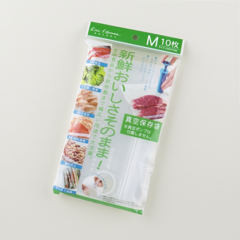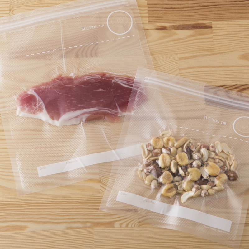 生鮮食品から乾物類まで、冷凍・冷蔵・常温と簡単操作で、幅広く使える真空保存袋です。