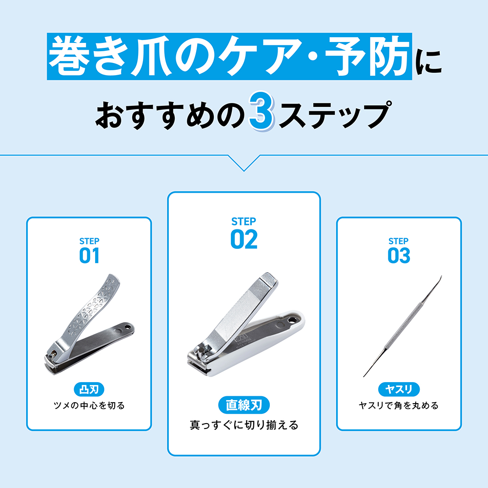 巻き爪のケアには凸刃で爪の中心を切り、直線刃でまっすぐ切り揃える「スクエアカット」がおすすめです。