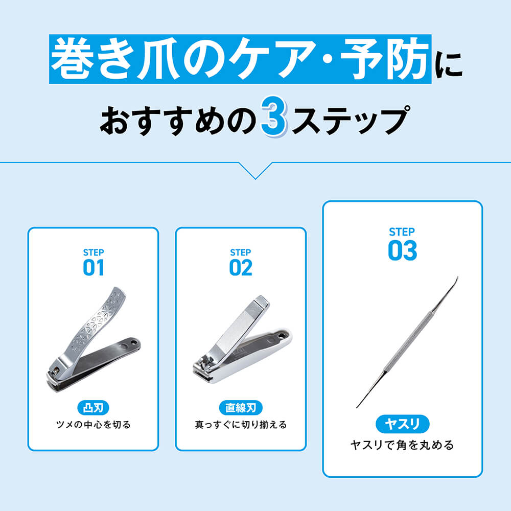 巻き爪はその形状からツメキリの刃が食い込みにくく、切りにくいのが悩みです。また、無理に横から切り込みを入れようとすると、爪が割れてしまう恐れがあります。