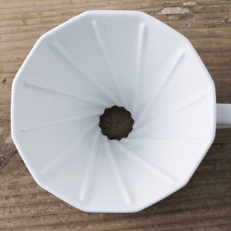 注いだお湯がそのままの速度で流れコーヒーがドリップされるよう、内部のリブ(凸部)を斜めに配置し底面の穴の形状も多角形のデザインを採用しました。