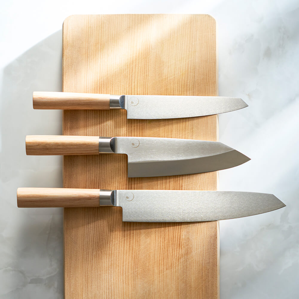 また、家庭での手入れ(砥ぎ)のしやすさを両立させるため、本来洋包丁の製造法である両刃付けを採用。長年、洋包丁を造ってきた貝印のノウハウを活かし、和包丁の特性を損なうことなく、利便性を向上させた新しいコンセプトの包丁に仕上がっています。