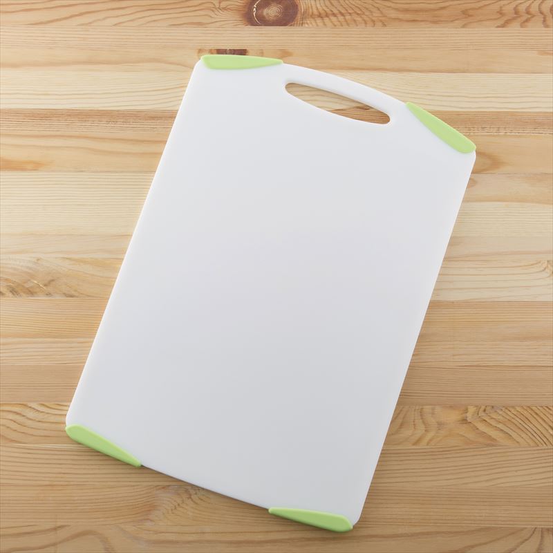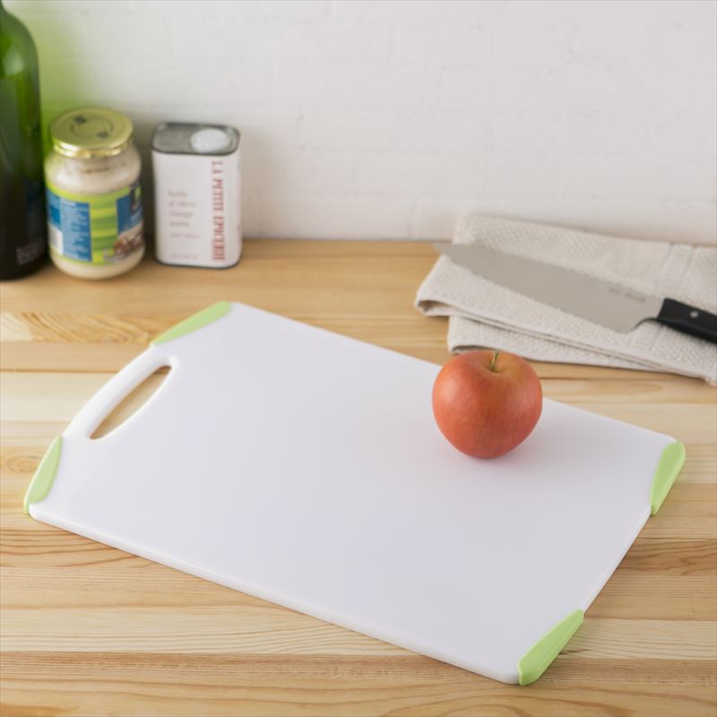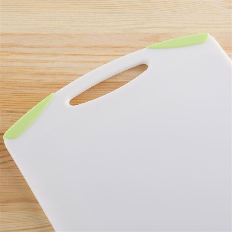 - 洗い物や収納もスイスイの驚きの軽さ、すべり止め付きなので安定して作業が行えます。水気のある食材をカットした時に、出てきた汁がこぼれにくいよう、板の中心に向かって薄くなる構造を採用しました。