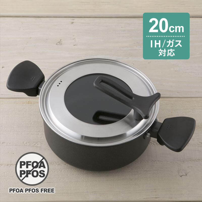 - 〈PFOA/PFOSフリー〉高機能・高品質にこだわりつつ、毎日の調理作業を楽にする、使いやすさにトコトンこだわったシリーズです。洗い物や収納するときに便利なとっても軽い鍋です。持ちやすい独自ハンドル形状で、傷や汚れに強い内面マーブルコーティング。IH・ガス火どちらにも使えます。薄い側面は鍋全体に素早く熱が回り、厚い底面が保温性を高めるので「時短」調理にも一役買う機能性両手鍋です。場所を取らない!立てて置けるガラス蓋付。こちらのフライパン・鍋はPFOA、およびPFOSを使用しておりません。