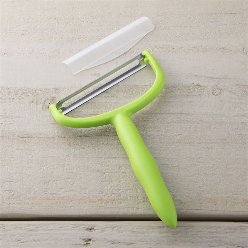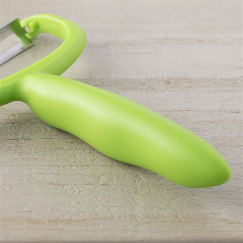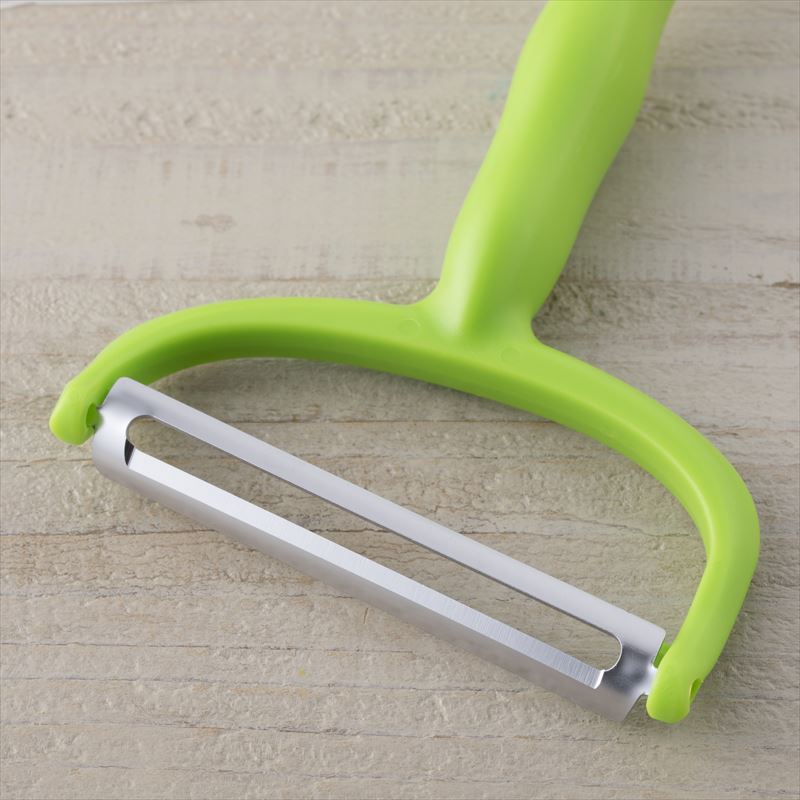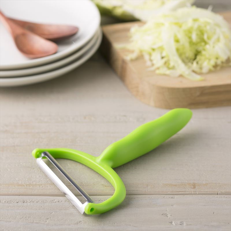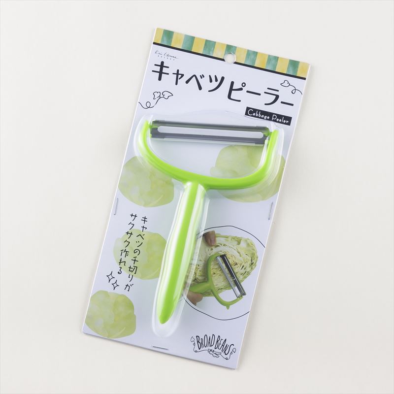 - キャベツの千切りがラクラクできるワイドサイズのピーラー。斜め刃でスムーズな切れ味。ハンドル部分は空豆の房をイメージした緩やかな凹凸が特徴で手になじみやすく握りやすい形状。キャベツの千切りだけでなく、玉ねぎのスライス、ゴボウのささがきなど色んな野菜のスライスもできます。