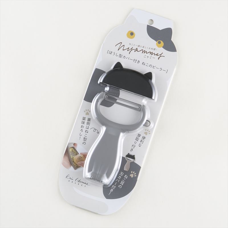 - “ねこと一緒に楽しくお料理!”当社売れ筋商品の性能を活かしつつ、キッチンの雰囲気を邪魔しない形でネコモチーフを取り入れました。ネコ好きの方もそうでない方も『欲しい!使いたい!』と思える、ほどよいネコ感を大切にしています。ネコがちょこんと座ったシルエットをモチーフにしたピーラーです。便利な芽取りはもちろん、裏側は薬味おろしに使えます(おろし金の形もネコなんです!)ネコ耳のぼうし型カバー付きで、収納時の安全性を高めています。
