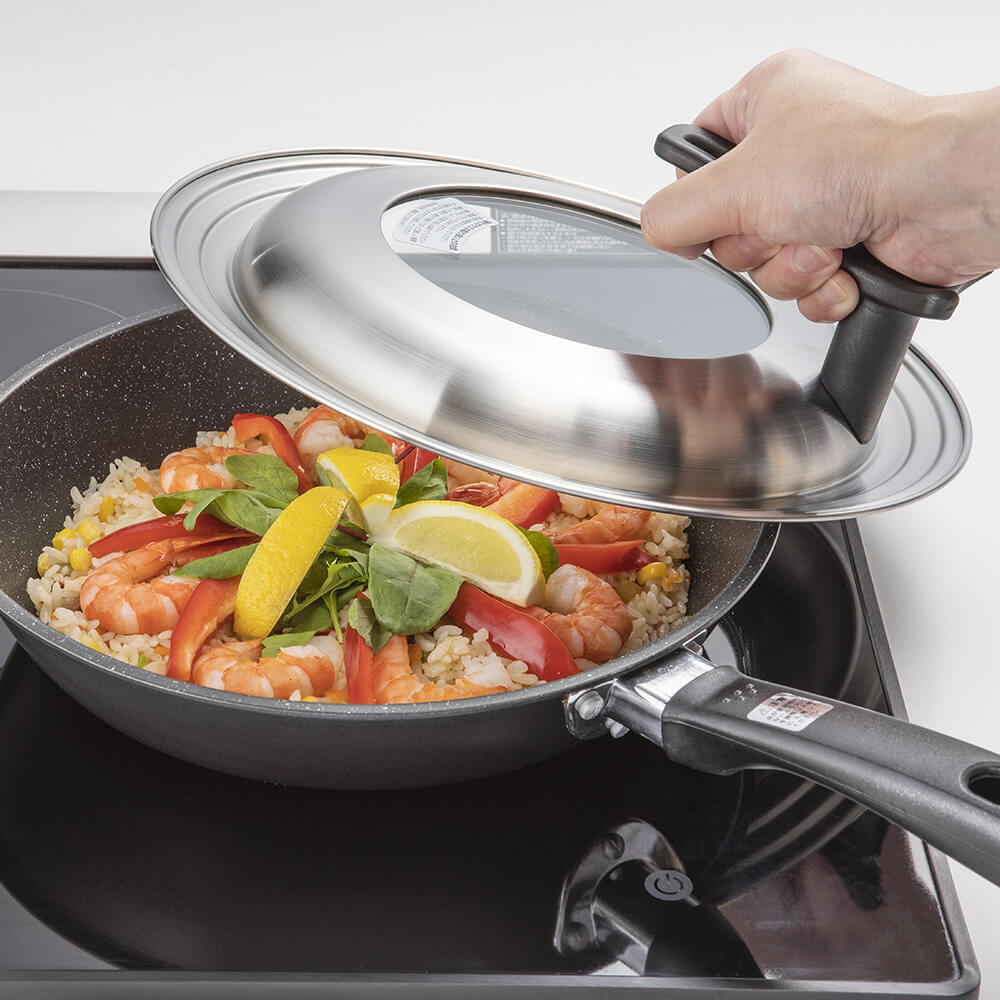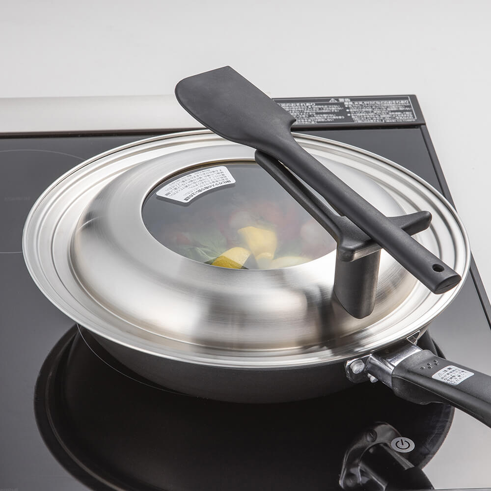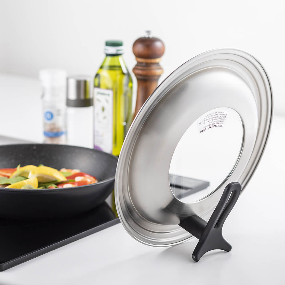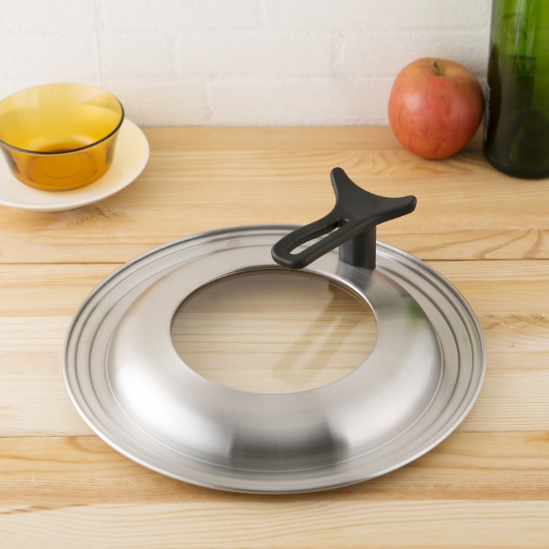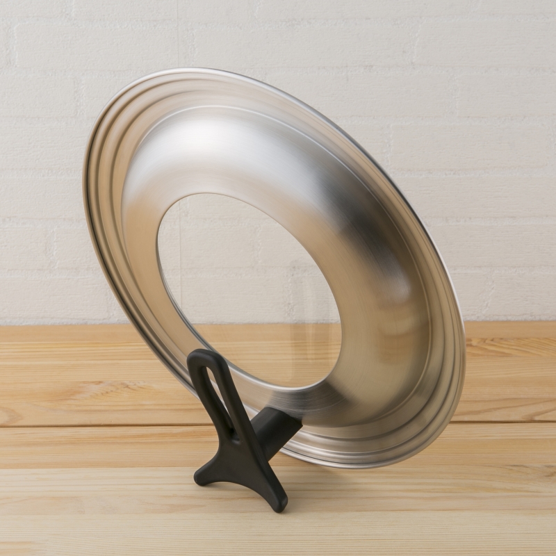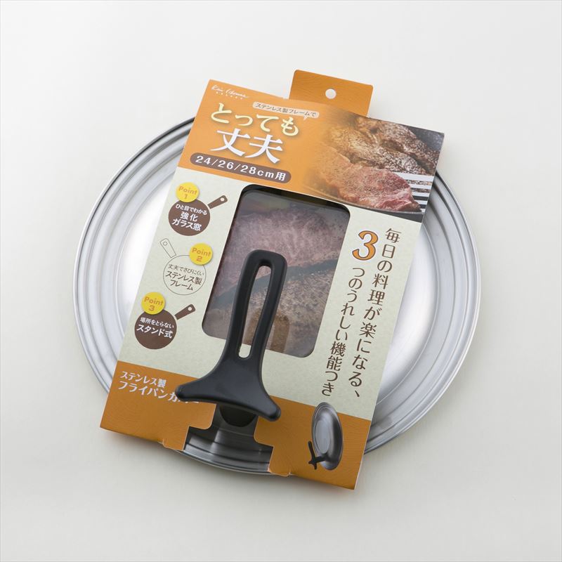 - ステンレス製フレームでとっても丈夫な、スタンド付きフライパンカバーです。[フライパンサイズ / 24・26・28cm用]ひと目で中がわかる強化ガラス窓で、丈夫でさびにくいステンレス製。場所をとらない便利なスタンド付き。