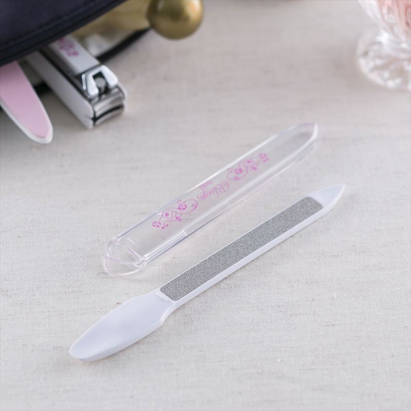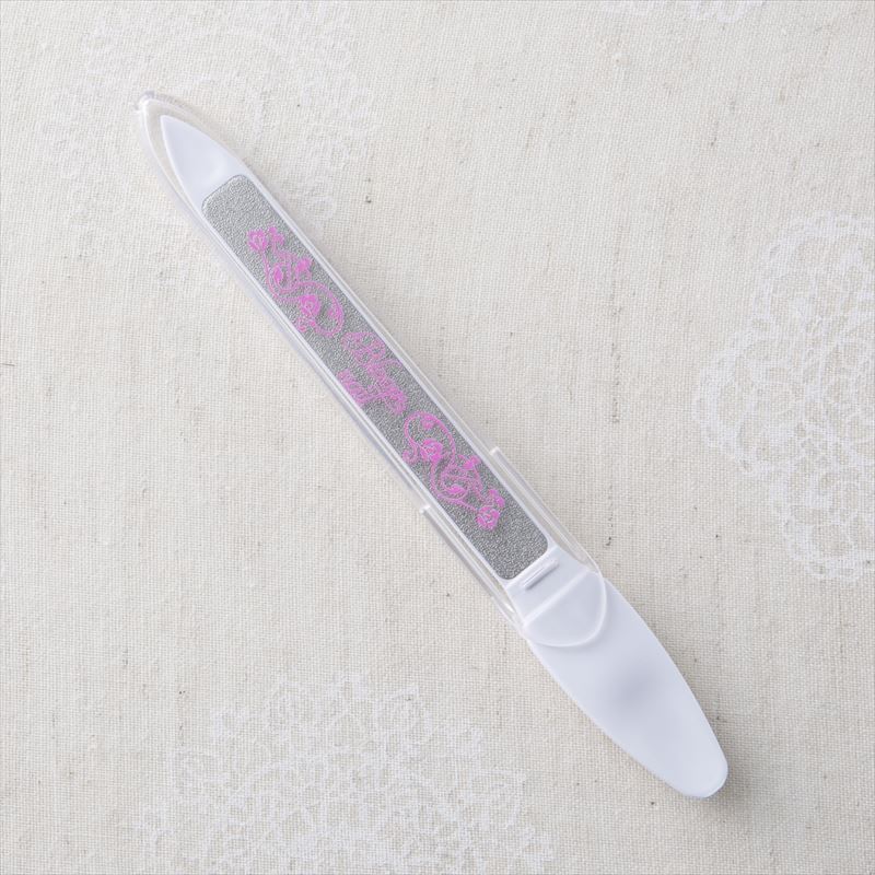 ツメキリで切った後の角を落とすようにツメの輪郭に沿ってヤスリがけしていきます。粗い面でこすった後、細かい面でなめらかに整えるときれいに仕上がります。粗目、細目の両面タイプ。蔦と花の柄をあしらったフェミニンなデザインです。