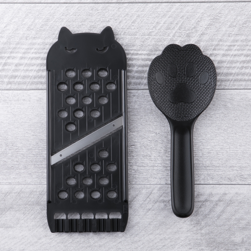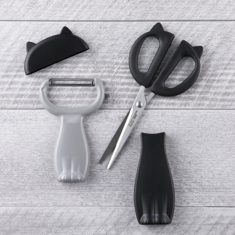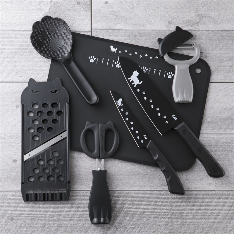 - “ねこと一緒に楽しくお料理!”当社売れ筋商品の性能を活かしつつ、キッチンの雰囲気を邪魔しない形でネコモチーフを取り入れました。ネコ好きの方もそうでない方も『欲しい!使いたい!』と思える、ほどよいネコ感を大切にしています。Nyammyシリーズのピーラー、三徳包丁、キッチンハサミ、フルーツナイフ、しゃもじ、スライサー、まな板が一式揃う、7点セットです。自宅用はもちろん、ネコ好きのご家族・ご友人への贈り物にもどうぞ♪