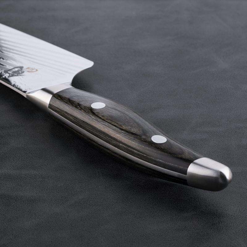 70層にも折り重ねられた2種類の高級鋼材から成る刃体は、美しい模様を作り出すだけでなく、