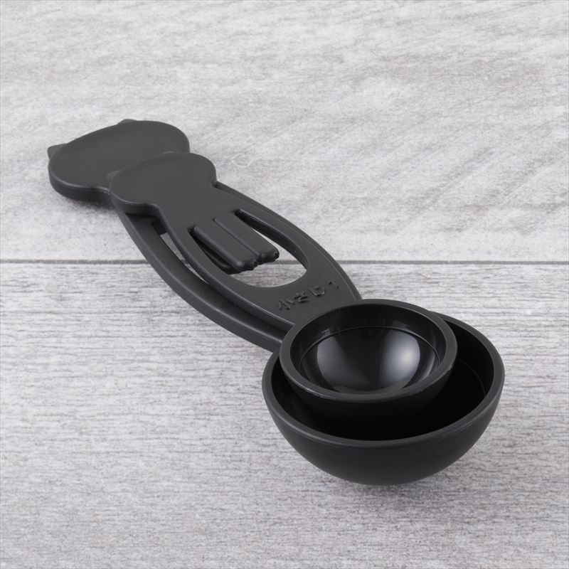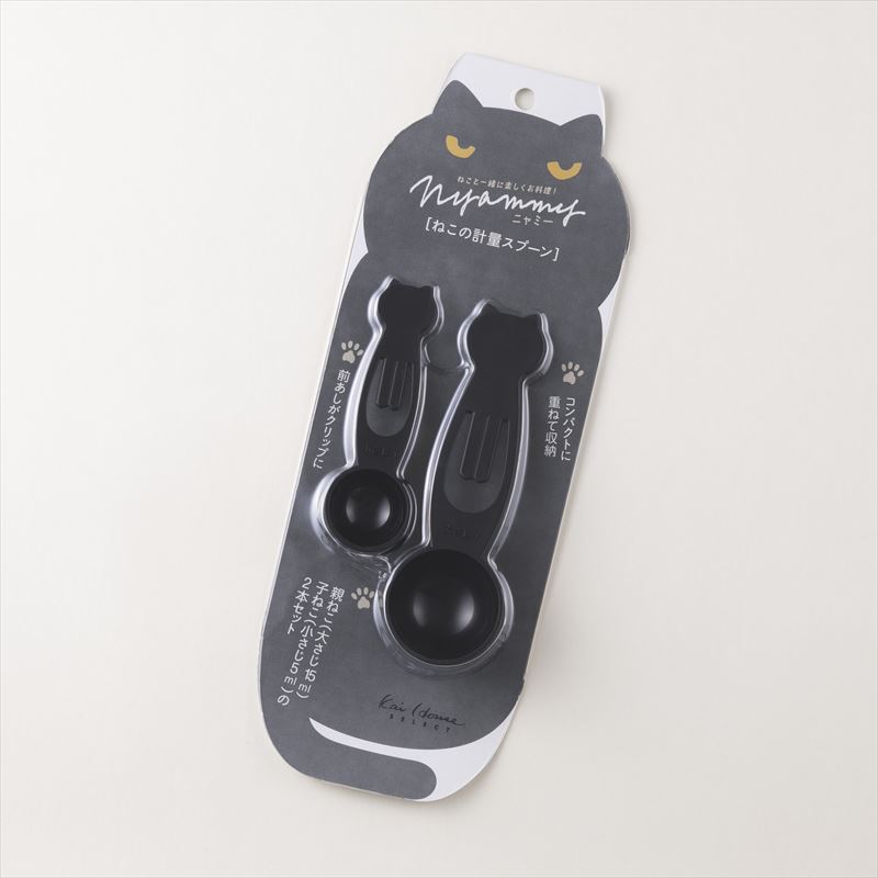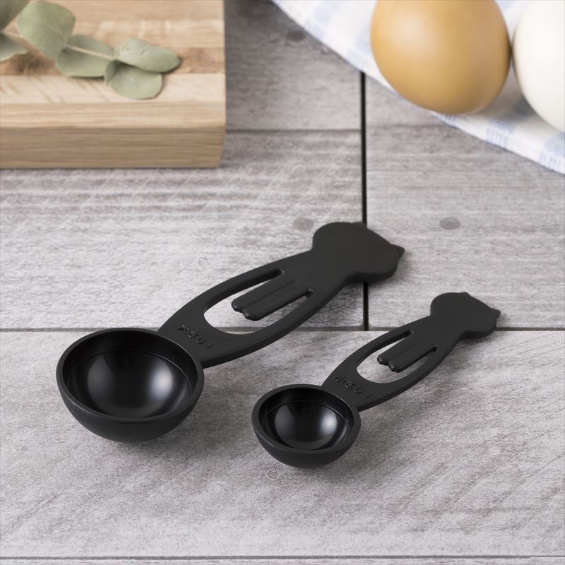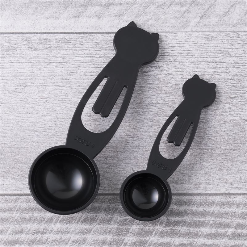 - “ねこと一緒に楽しくお料理!”当社売れ筋商品の性能を活かしつつ、キッチンの雰囲気を邪魔しない形でネコモチーフを取り入れました。ネコ好きの方もそうでない方も『欲しい!使いたい!』と思える、ほどよいネコ感を大切にしています。親ねこ(大さじ15ml)、子ねこ(小さじ5ml)の2本セットで、重ねて収納できます。計量部に1/2ラインが入っており、大さじ1/2、小さじ1/2も計れます。前足がクリップになっているのでコーヒーや小麦粉などの袋を仮留めするのに使えます。