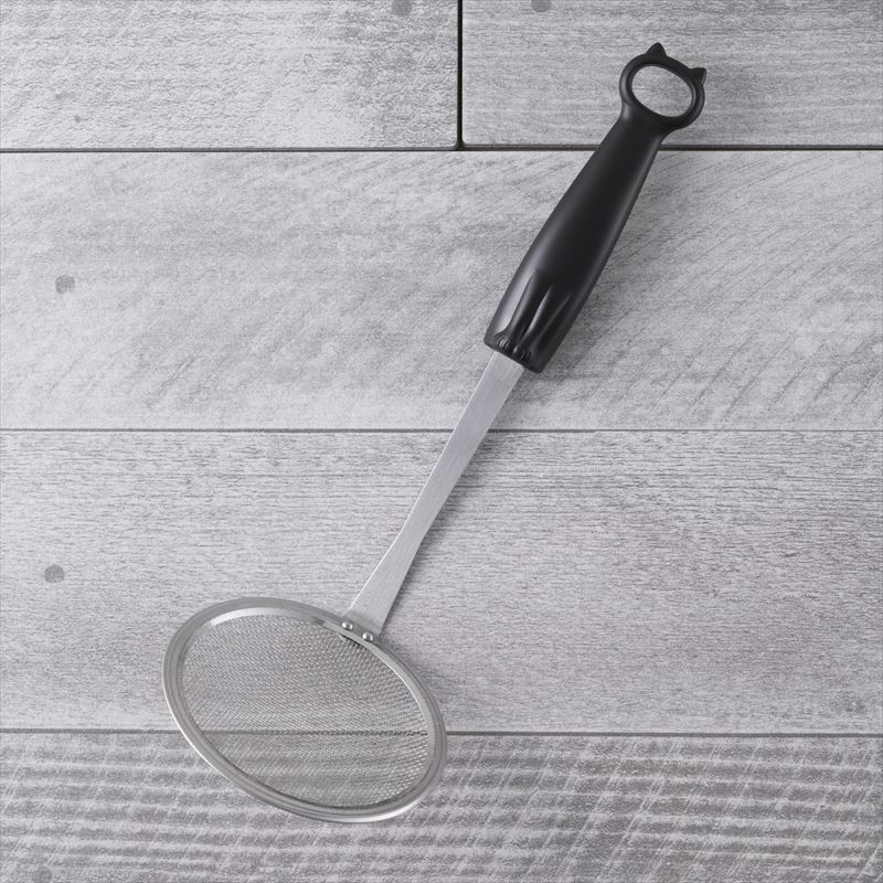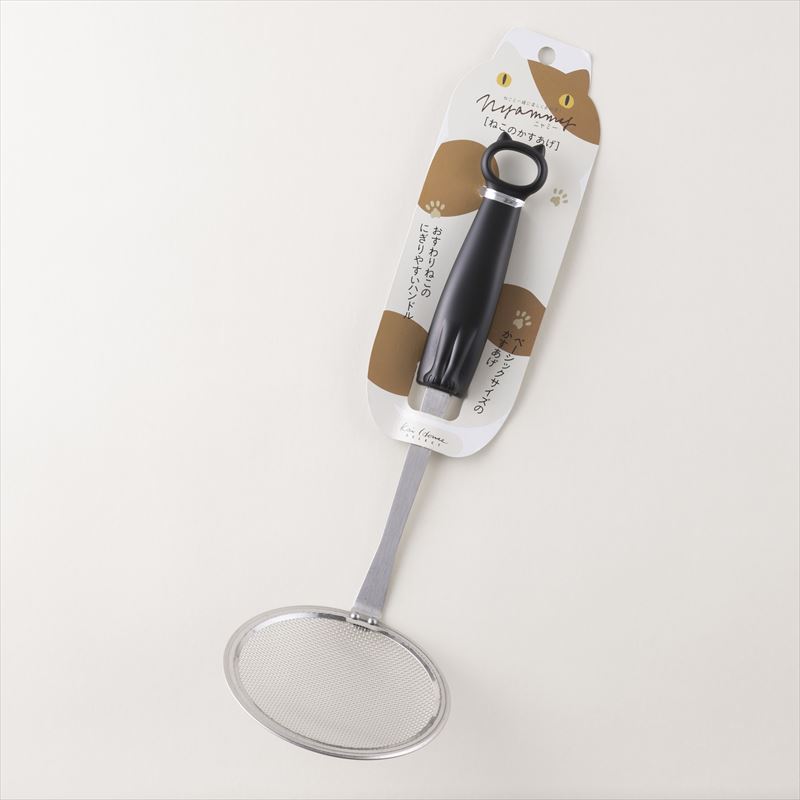 - “ねこと一緒に楽しくお料理!”当社売れ筋商品の性能を活かしつつ、キッチンの雰囲気を邪魔しない形でネコモチーフを取り入れました。ネコ好きの方もそうでない方も『欲しい!使いたい!』と思える、ほどよいネコ感を大切にしています。おすわりねこの握りやすいハンドルが特長の、ベーシックサイズのかすあげです。