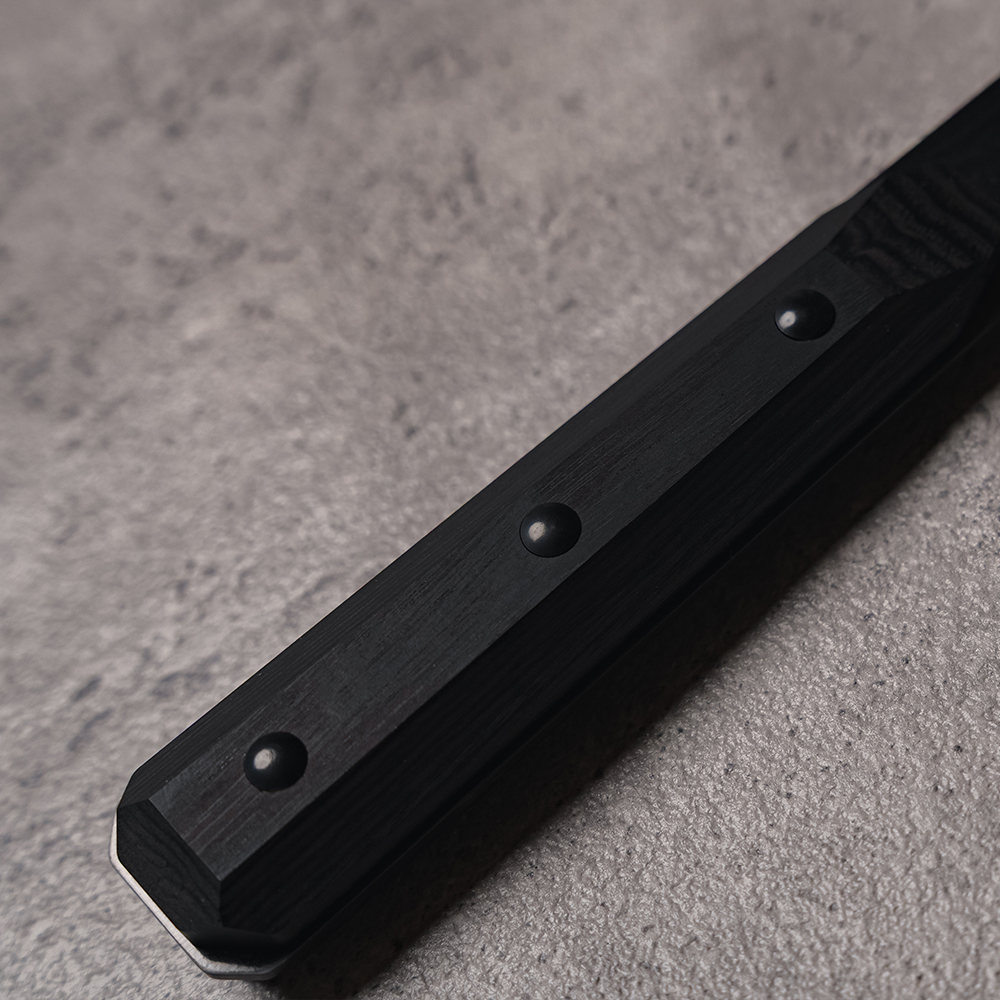全体を面でカットし、カシメ鋲と刀身中子を露出させた特徴的なデザインです。