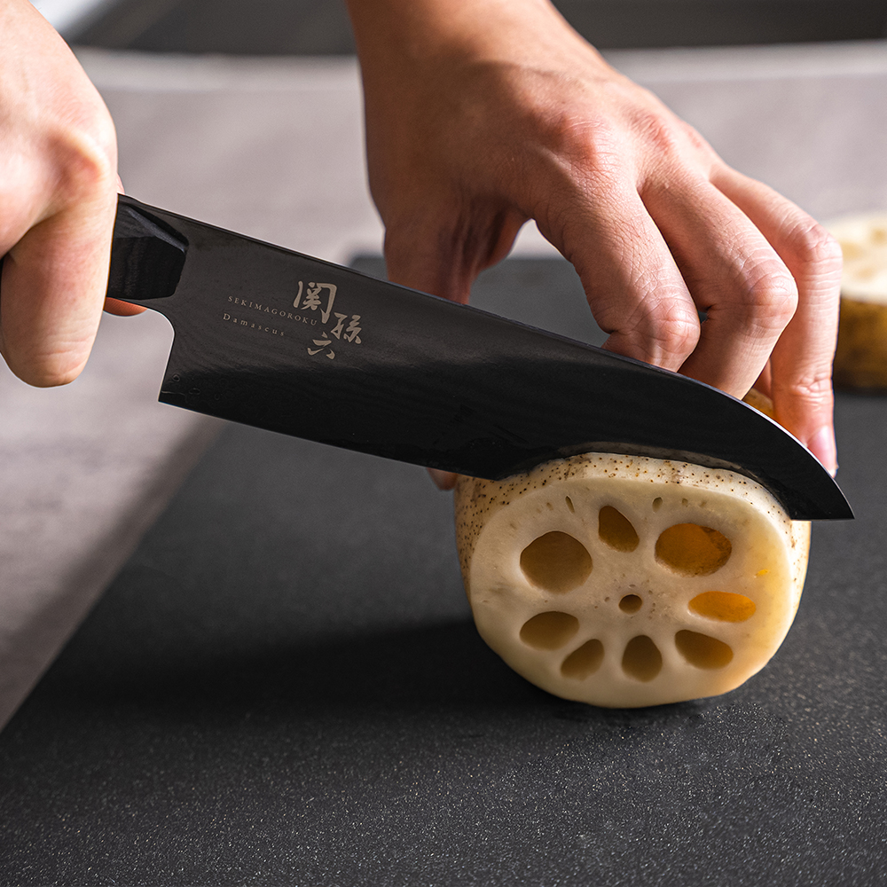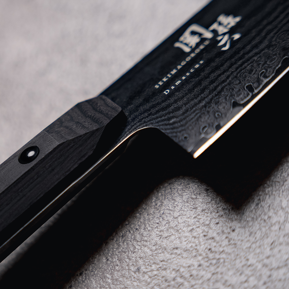 刃先側が槌目、背側が墨流しを彷彿とさせる、貝印独自の特徴的なダマスカス模様の刃体です。