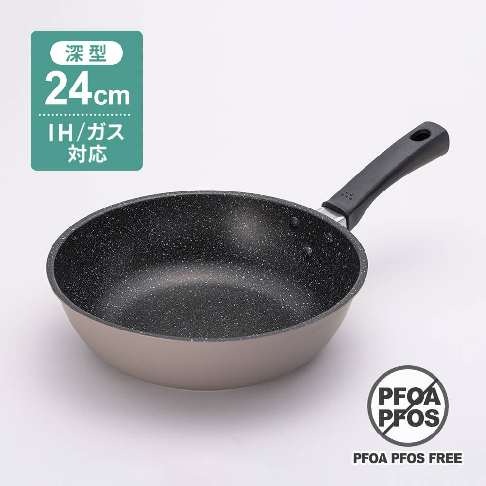 メインの「軽いフライパン20cm」と「軽いマルチ炒め鍋24cm」は、重量バランスを工夫し、重さを感じにくい設計です。
